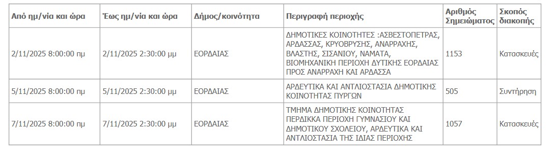 Προκειμένου να προγραμματίσετε τις εργασίες σας και να ελαχιστοποιηθεί η όχλησή σας, στον ακόλουθο πίνακα, μπορείτε να ενημερωθείτε για τις περιοχές και τις ώρες προγραμματισμένων διακοπών ηλεκτροδότησης.