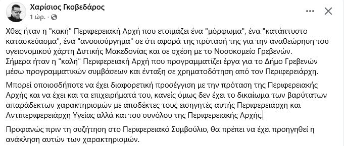 Με ανάρτησή του στα μέσα κοινωνικής δικτύωσης, ο περιφερειακός σύμβουλος Χάρης Γκοβεδάρος σχολίασε με αιχμηρό τρόπο τη στάση του Δημάρχου Γρεβενών Κυριάκου Ταταρίδη, με αφορμή τις πρόσφατες τοποθετήσεις του για την πρόταση της Περιφερειακής Αρχής σχετικά με την αναθεώρηση του Υγειονομικού Χάρτη Δυτικής Μακεδονίας.