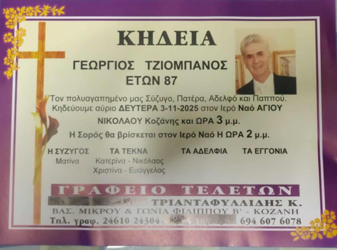 Έφυγε από την ζωή ο Γεώργιος Τζιομπάνος. Η κηδεία του θα γίνει σήμερα Δευτέρα 3/11 στον Ι.Ν. Αγ. Νικολάου Κοζάνης.