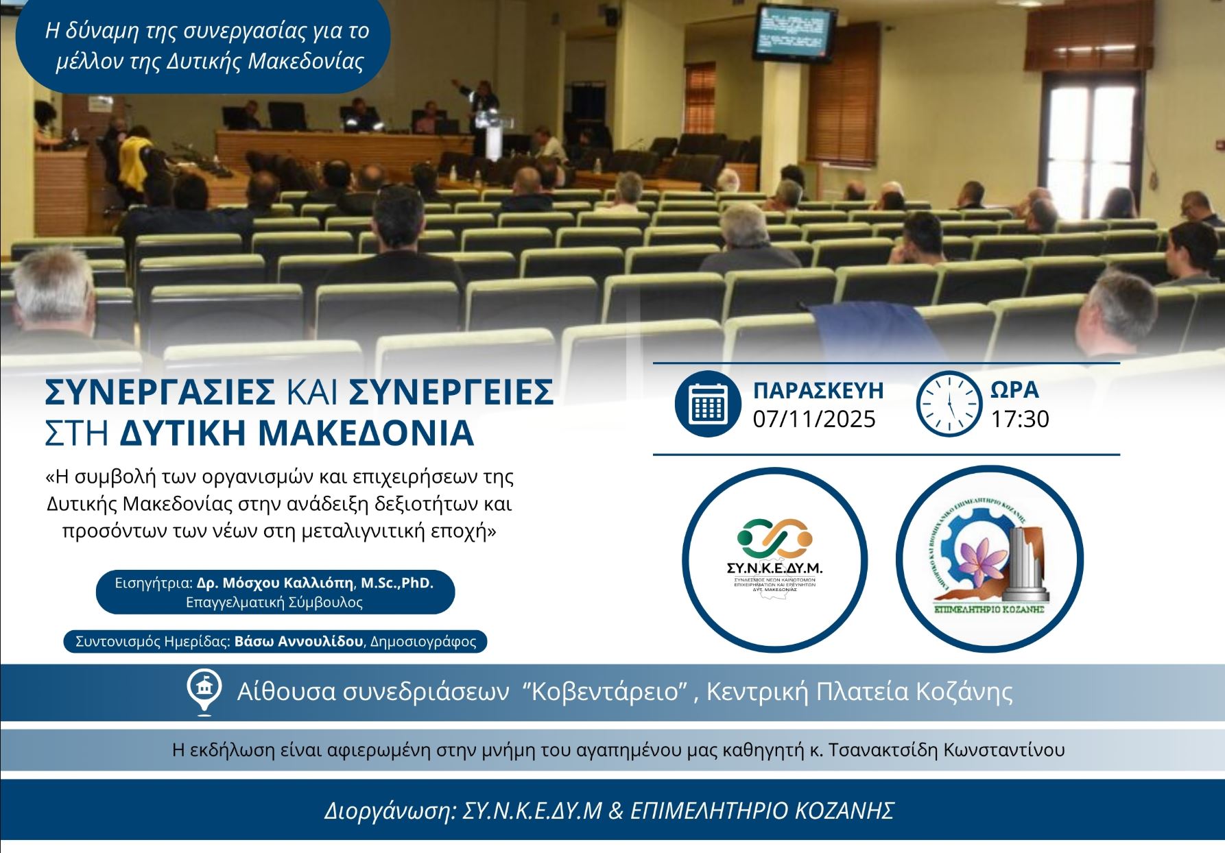 Ο Σύνδεσμος Νέων Καινοτόμων Επιχειρηματιών και Ερευνητών Δυτικής Μακεδονίας (ΣΥ.Ν.Κ.Ε.ΔΥ.Μ.) σε συνεργασία με το Επιμελητήριο Κοζάνης σας προσκαλούν στην ημερίδα με θέμα:   « Συνεργασίες και Συνέργειες στην Δυτική Μακεδονία »