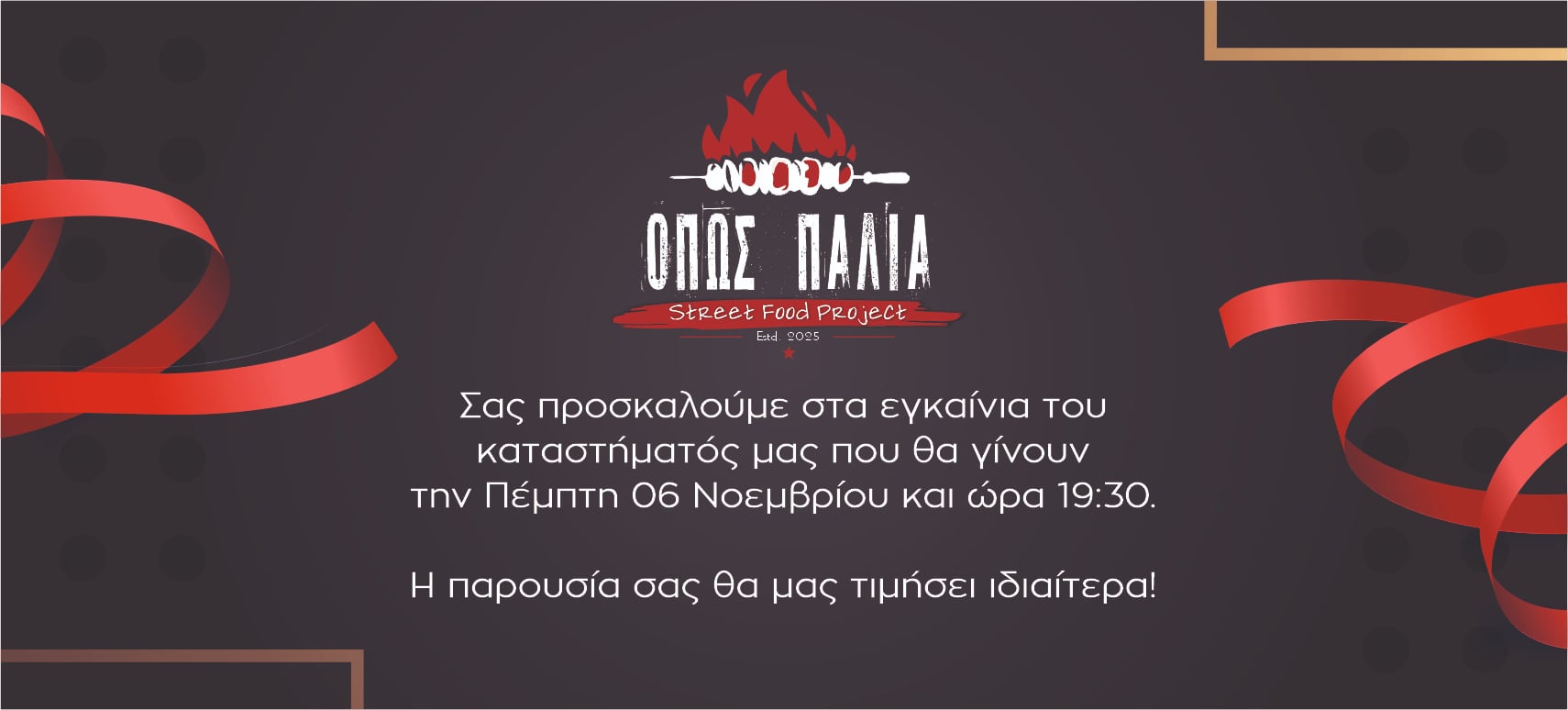 Το «Όπως Παλιά – Street Food Project», επί της οδού Μεγάλου Αλεξάνδρου 48 (Πλατεία Αλώνια) στην Κοζάνη, σας προσκαλεί στα εγκαίνια του καταστήματός του, που θα πραγματοποιηθούν σήμερα Πέμπτη 6 Νοεμβρίου, στις 19:30.