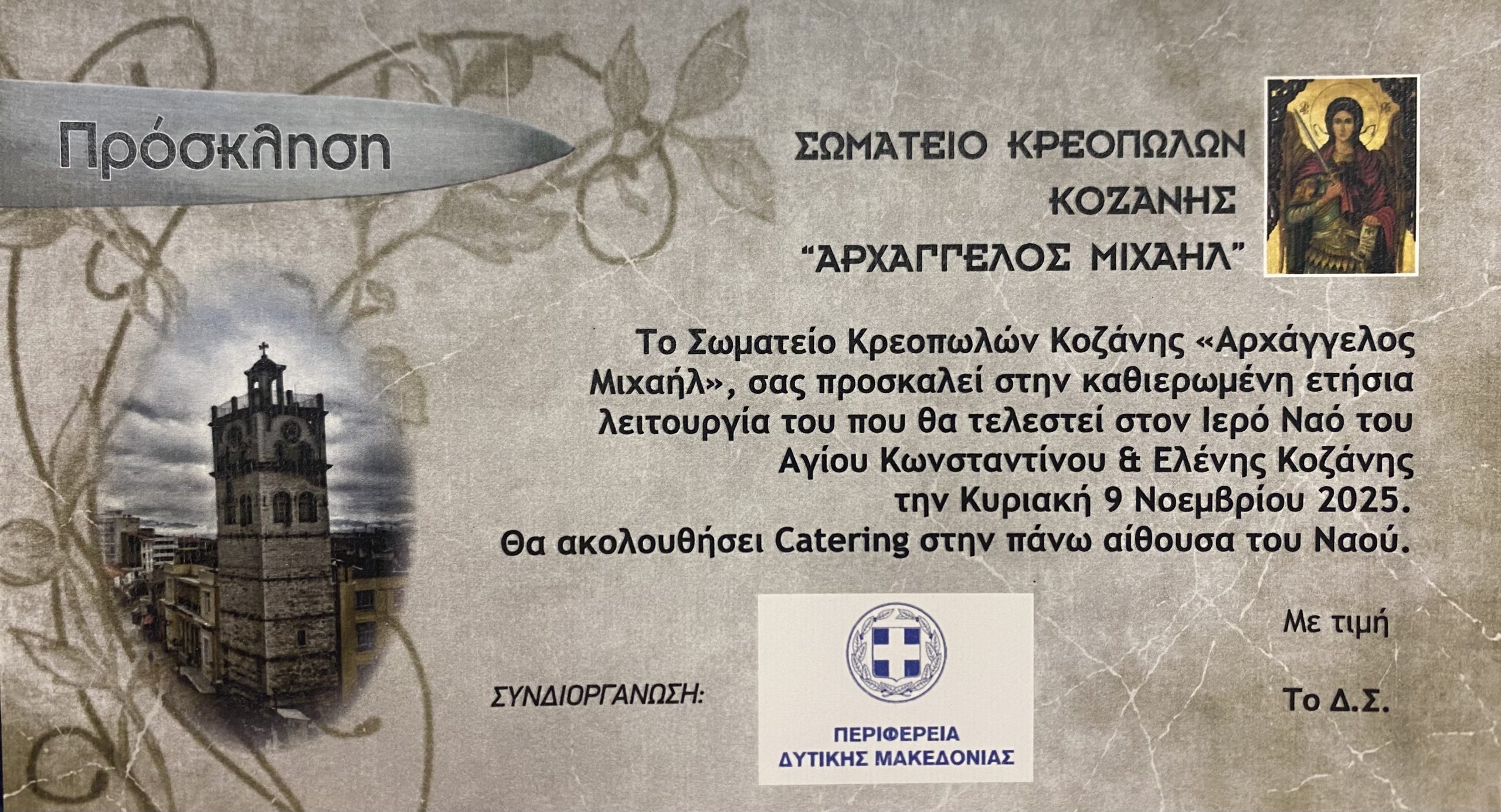 Το Σωματείο Κρεοπωλών Κοζάνης «Αρχάγγελος Μιχαήλ» διοργανώνει, την Κυριακή 9 Νοεμβρίου 2025, την καθιερωμένη ετήσια λειτουργία του, στον Ιερό Ναό Αγίων Κωνσταντίνου & Ελένης Κοζάνης.