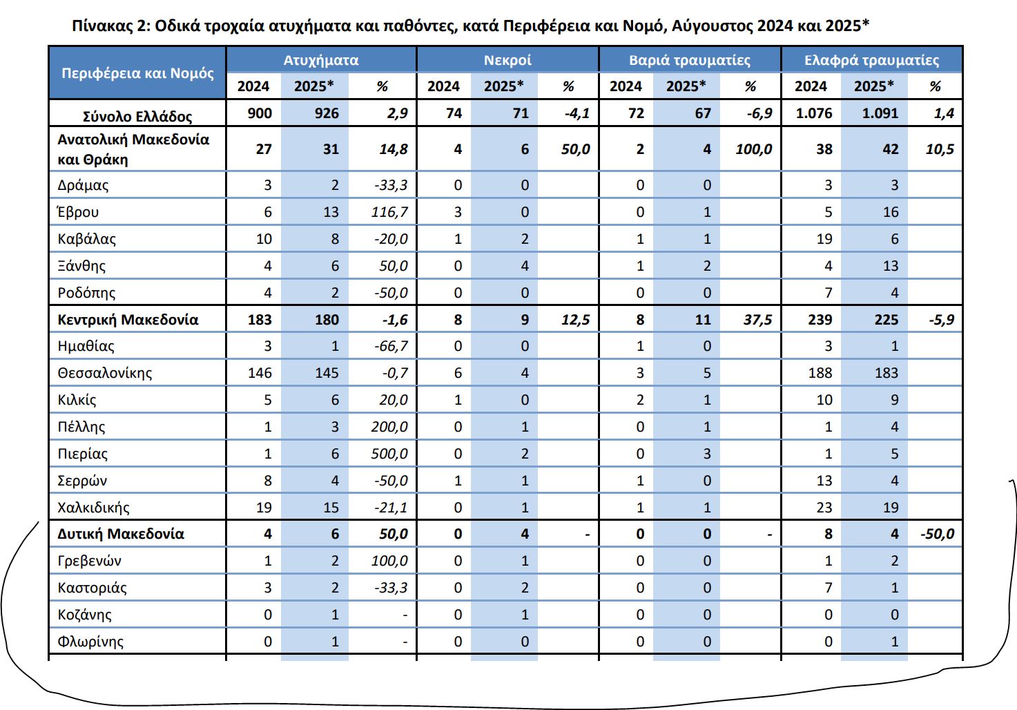 Η Δυτική Μακεδονία αντιπροσωπεύει το 0,6% των τροχαίων της χώρας, αλλά η απότομη αύξηση των θανατηφόρων ατυχημάτων σε μόλις έναν μήνα δημιουργεί έντονο προβληματισμό. Σε εθνικό επίπεδο, καταγράφηκαν 926 τροχαία (+2,9%), με 71 νεκρούς και 67 βαριά τραυματίες, παρουσιάζοντας μικρή μείωση στους νεκρούς (-4,1%), αλλά αύξηση στα ατυχήματα.