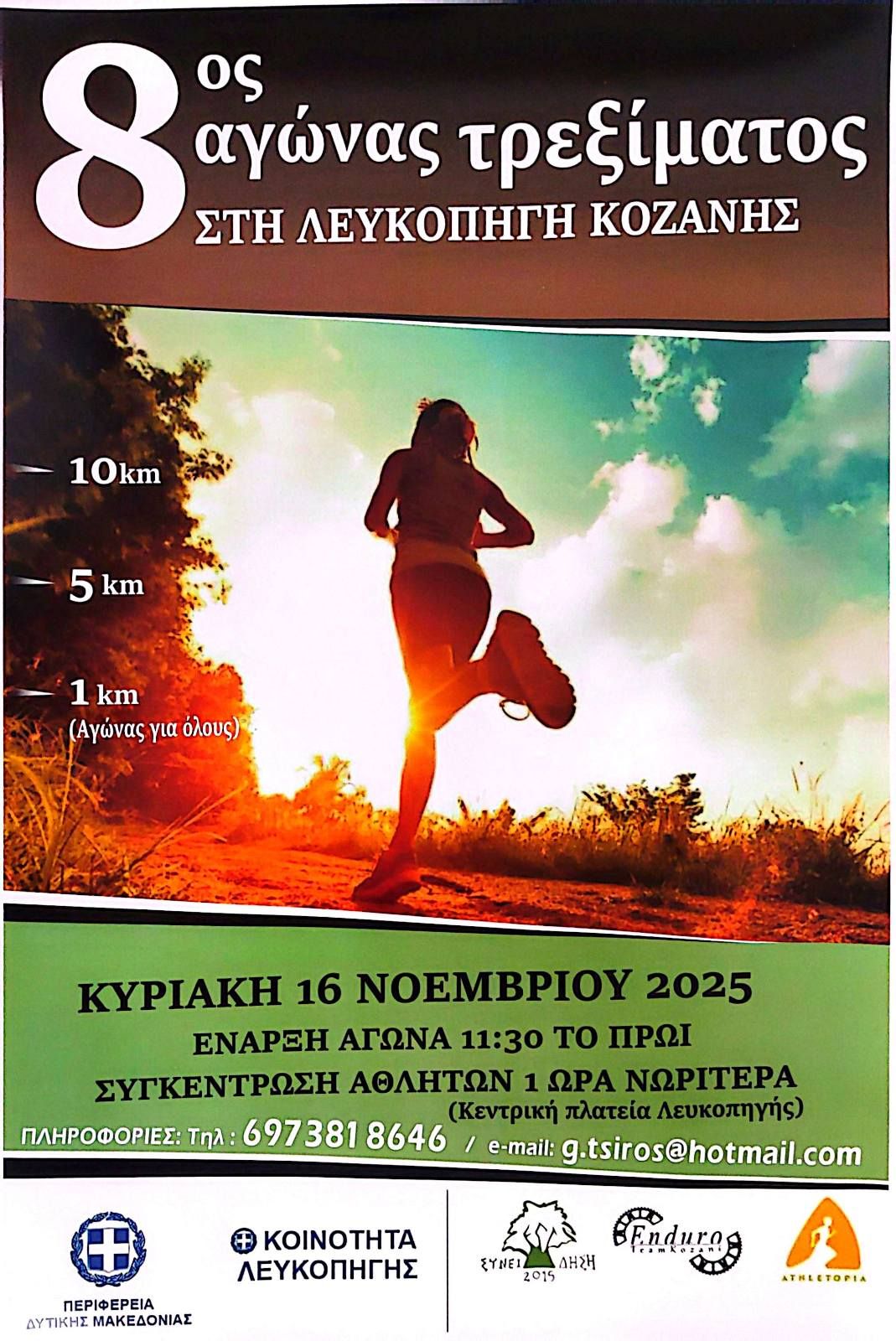 H Λευκοπηγή Κοζάνης ετοιμάζεται να υποδεχθεί δρομείς κάθε ηλικίας και επιπέδου, στον 8ο Αγώνα Τρεξίματος, που θα πραγματοποιηθεί την Κυριακή 16 Νοεμβρίου 2025.