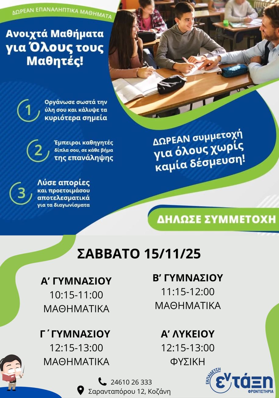 Το Φροντιστήριο Εν-τάξη διοργανώνει και φέτος βοηθητικά μαθήματα για όλους τους μαθητές Γυμνασίου και Α’ Λυκείου. Τα μαθήματα αυτά είναι εντελώς δωρεάν, χωρίς καμία οικονομική επιβάρυνση ή υποχρέωση εγγραφής και σκοπό έχουν να βοηθήσουν τους μαθητές στις ανάγκες των σχολικών τεστ και διαγωνισμάτων. Ο φετινός κύκλος ξεκινάει με το μάθημα των Μαθηματικών για τους μαθητές Γυμνασίου και της Φυσικής για τους μαθητές της Α’ Λυκείου, το Σάββατο 15.11.2025.