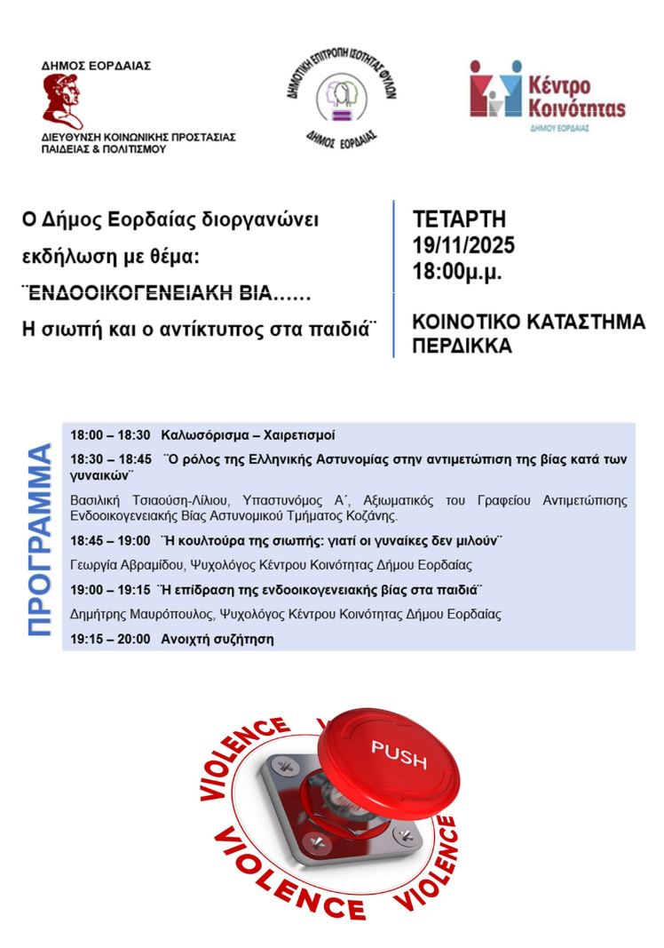 Ο Δήμος Εορδαίας, μέσω της Διεύθυνσης Κοινωνικής Προστασίας, Παιδείας & Πολιτισμού, της Δημοτικής Επιτροπής Ισότητας των Φύλων και του Κέντρου Κοινότητας, διοργανώνει την Τετάρτη 19 Νοεμβρίου 2025, στις 18:00, εκδήλωση με θέμα: «Ενδοοικογενειακή Βία… Η σιωπή και ο αντίκτυπος στα παιδιά»