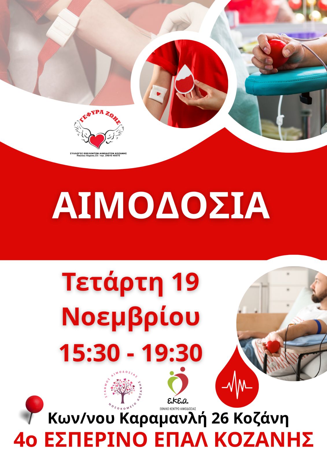 Την Τετάρτη 19 Νοεμβρίου 2025 και ώρα 15:30 – 19:30 στο χώρο του 4ου εσπερινού ΕΠΑΛ διοργανώνεται αιμοδοσία από τον Σ.Ε.Α «ΓΕΦΥΡΑ ΖΩΗΣ» σε συνεργασία με το τμήμα Αιμοδοσίας του «Μαμάτσειου» Γ. Ν. Κοζάνης, με τη συμμετοχή των μαθητών και διδασκόντων του ΕΠΑΛ.