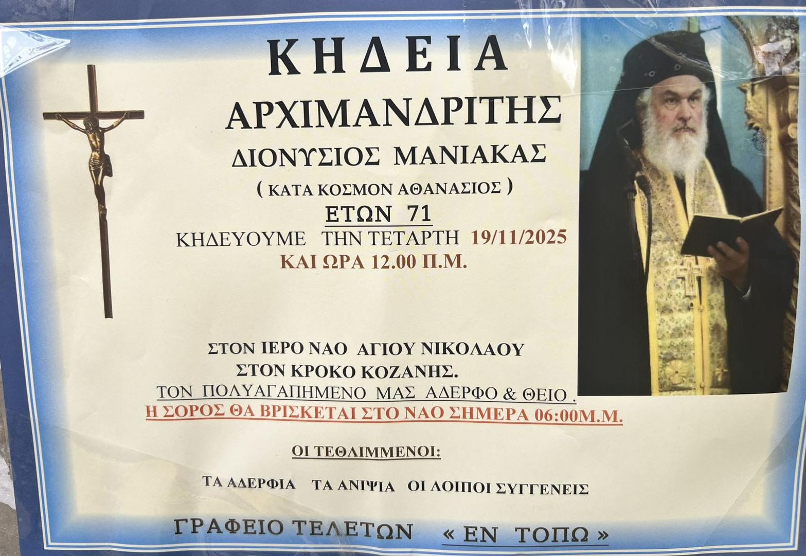 Εκοιμήθη, σε ηλικία 71 ετών, ο Αρχιμανδρίτης Διονύσιος Μανιάκας (κατά κόσμον Αθανάσιος). H κηδεία του θα γίνει την Τετάρτη 19/11 στις 12 το μεσημέρι στον Ι.Ν. Αγ. Νικολάου στον Κρόκο Κοζάνης. Διετέλεσε επί χρόνια ιεροκήρυκας της Ιεράς Μητροπόλεως Βεροίας.