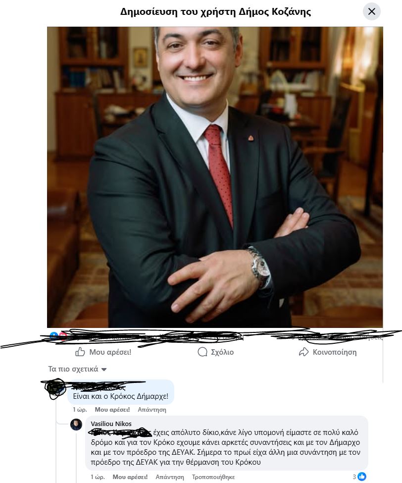 Συγκεκριμένα έγραψε: «Έχεις απόλυτο δίκιο, κάνε λίγο υπομονή. Είμαστε σε πολύ καλό δρόμο και για τον Κρόκο. Έχουμε κάνει αρκετές συναντήσεις και με τον Δήμαρχο και με τον πρόεδρο της ΔΕΥΑΚ. Σήμερα το πρωί είχα άλλη μια συνάντηση με τον πρόεδρο της ΔΕΥΑΚ για την θέρμανση του Κρόκου.»