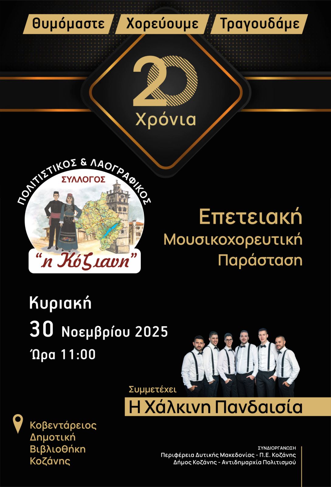Ο Πολιτιστικός & Λαογραφικός Σύλλογος «Η Κόζιανη» γιορτάζει φέτος 20 χρόνια δημιουργικής πορείας στο χώρο του πολιτισμού και της παράδοσης.