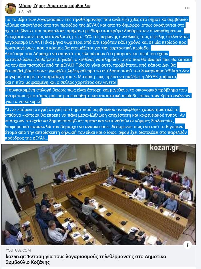 Για το θέμα των λογαριασμών της τηλεθέρμανσης που ανέδειξα χθες στο δημοτικό συμβούλιο λάβαμε απαντήσεις από τον πρόεδρο της ΔΕΥΑΚ και από το δήμαρχο, όπως ακούγονται στο σχετικό βίντεο, που προκαλούν αμήχανο μειδίαμα και κράμα δυσάρεστων συναισθημάτων…