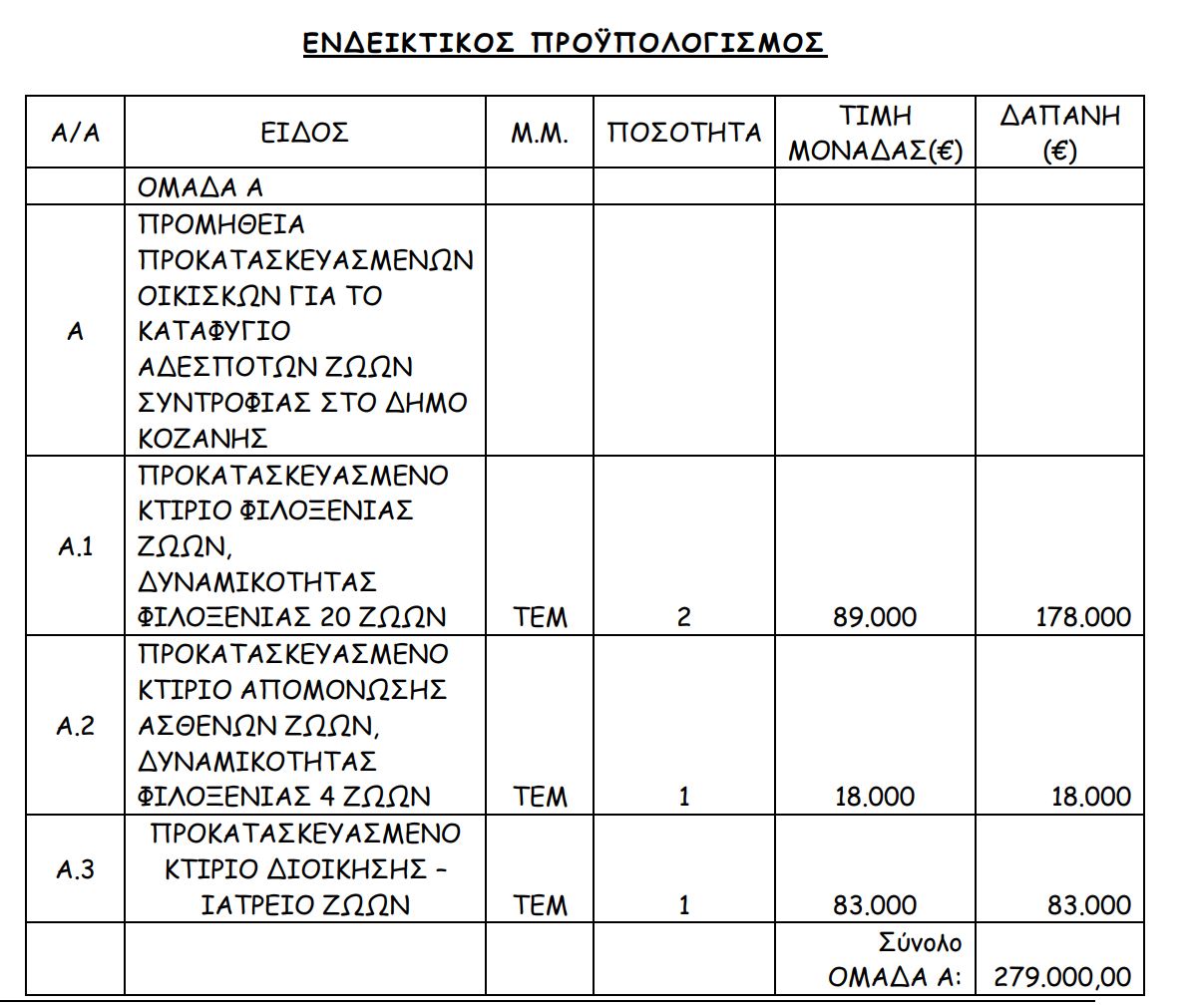 I. ΟΜΑΔΑ Α: ΠΡΟΜΗΘΕΙΑ ΠΡΟΚΑΤΑΣΚΕΥΑΣΜΕΝΩΝ ΟΙΚΙΣΚΩΝ ΓΙΑ ΤΟ ΚΑΤΑΦΥΓΙΟ ΑΔΕΣΠΟΤΩΝ ΖΩΩΝ ΣΥΝΤΡΟΦΙΑΣ ΣΤΟ ΔΗΜΟ ΚΟΖΑΝΗΣ (Προκατασκευασμένα κτίρια)