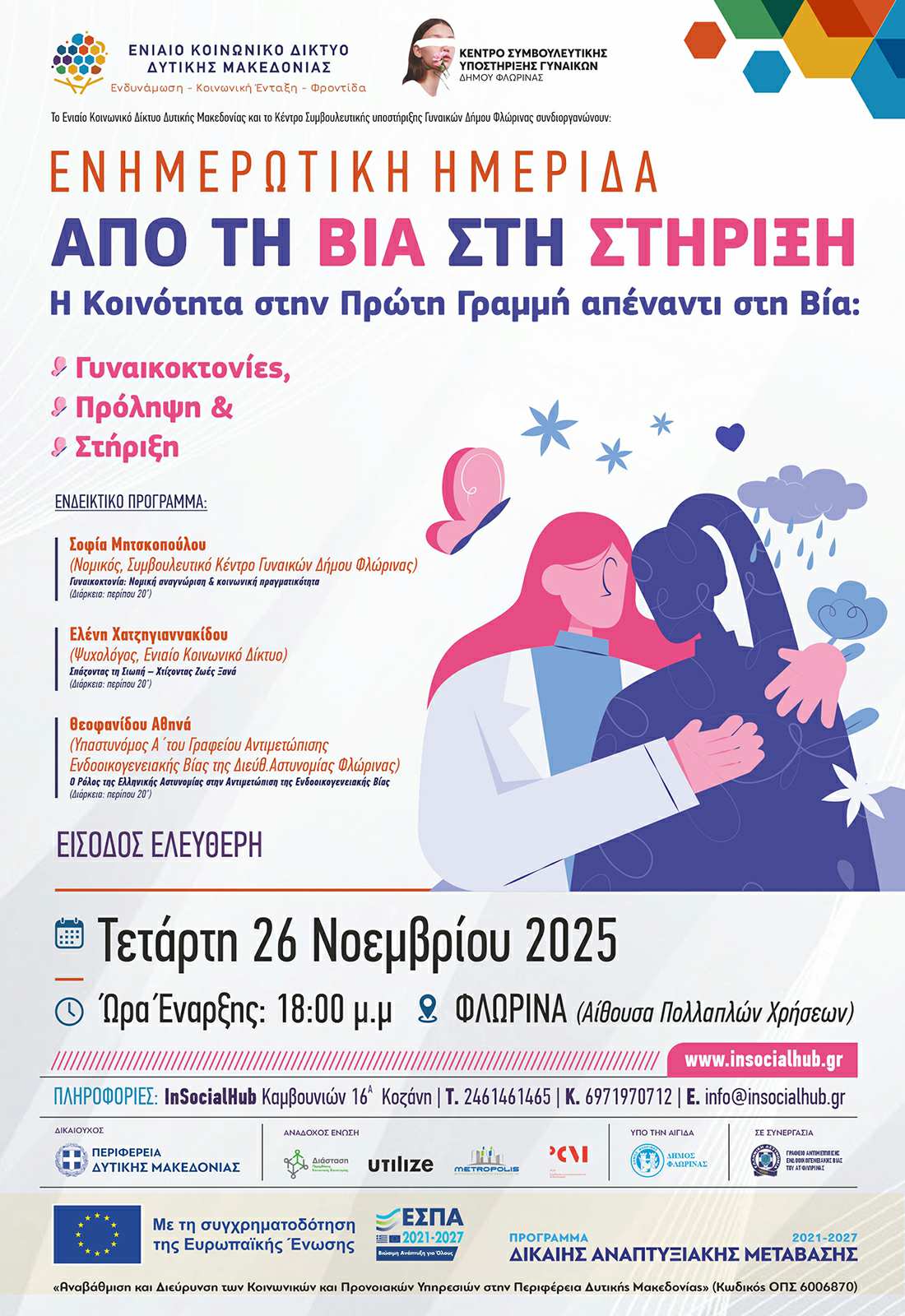 Το Ενιαίο Κοινωνικό Δίκτυο Δυτικής Μακεδονίας, σε συνεργασία με το Κέντρο Συμβουλευτικής Υποστήριξης Γυναικών Φλώρινας, διοργανώνει ημερίδα με στόχο την ενημέρωση και ευαισθητοποίηση για την έμφυλη και ενδοοικογενειακή βία, καθώς και τη στήριξη των γυναικών που την αντιμετωπίζουν.