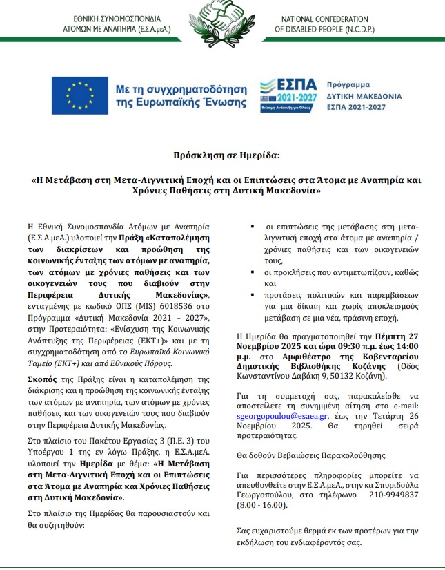 Η Ε.Σ.Α.μεΑ. υλοποιεί την Πράξη «Καταπολέμηση των διακρίσεων και προώθηση της κοινωνικής ένταξης των ατόμων με αναπηρία, των ατόμων με χρόνιες παθήσεις και των οικογενειών τους που διαβιούν στην Περιφέρεια Δυτικής Μακεδονίας», ενταγμένης με κωδικό ΟΠΣ (MIS) 6018536 στο Πρόγραμμα «Δυτική Μακεδονία 2021 – 2027», στην Προτεραιότητα: «Ενίσχυση της Κοινωνικής Ανάπτυξης της Περιφέρειας (ΕΚΤ+)» και με τη συγχρηματοδότηση από το Ευρωπαϊκό Κοινωνικό Ταμείο (ΕΚΤ+) και από Εθνικούς Πόρους.
