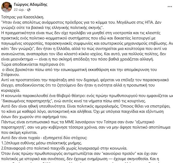 Με αφορμή το βιβλίο του πρώην Πρωθυπουργού Α. Τσίπρα, οι συζητήσεις έχουν ανάψει – και σε τοπικό επίπεδο – κυρίως μέσα στους κόλπους της Αριστεράς. Δεν αποκλείεται μάλιστα, πολύ σύντομα, να δούμε και δημόσιες αντιπαραθέσεις, να εξελίσσονται μέσω αναρτήσεων στα μέσα κοινωνικής δικτύωσης. Ήδη μια πρώτη αντίδραση είδαμε από τον πρώην Πρόεδρο της ΓΕΝΟΠ/ΔΕΗ Γ. Αδαμίδη, ο οποίος, μέσα από ανάρτησή του στο facebook – κλικ εδώ – άνοιξε τον κύκλο των τοποθετήσεων, δίνοντας το στίγμα ότι η συζήτηση για το βιβλίο Τσίπρα δεν θα περιοριστεί σε ήπιους σχολιασμούς, αλλά θα προκαλέσει κι έντονους διαλόγους.