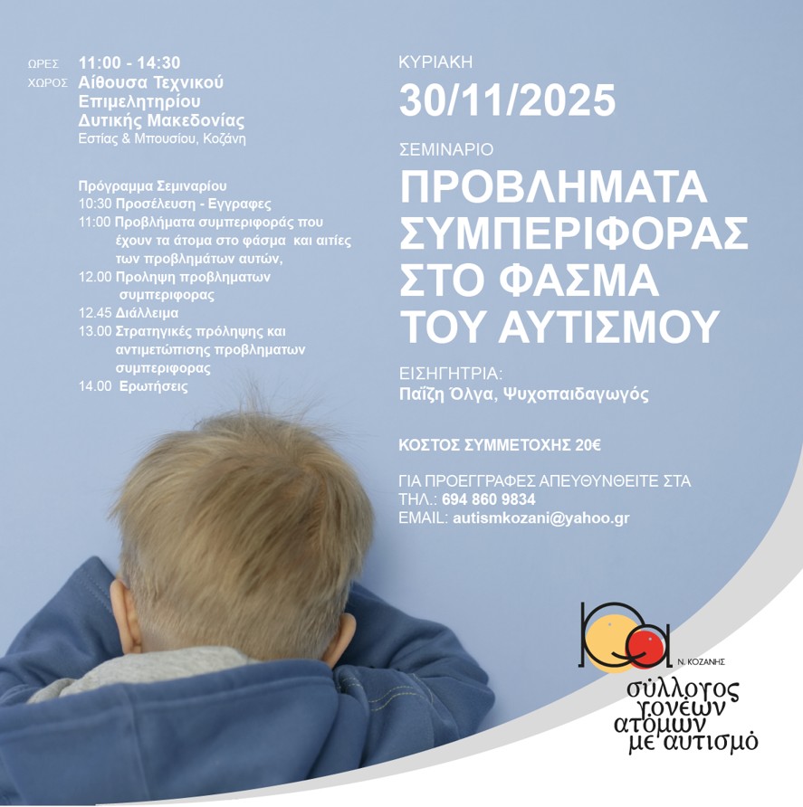 Ο Σύλλογος Γονέων Κηδεμόνων και Φίλων Ατόμων με αυτισμό Ν.Κοζάνης την Κυριακή, 30 Νοεμβρίου 2025, διοργανώνει ημερίδα με θέμα: «Αυτισμός και Προβλήματα Συμπεριφοράς» στην αίθουσα σεμιναρίων του Τεχνικού Επιμελητηρίου Ελλάδος Τμήμα Δυτικής Μακεδονίας στην οδό Εστίας και Μπουσίου (1ος όροφος) στην Κοζάνη.