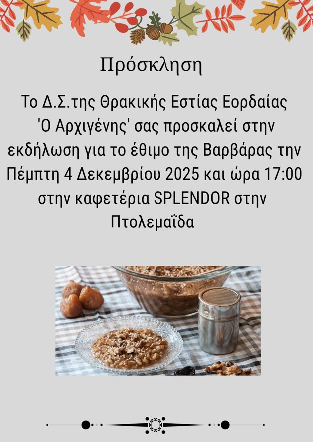 Το Διοικητικό Συμβούλιο της Θρακικής Εστίας Εορδαίας προσκαλεί τα μέλη και τους φίλους του συλλόγου στην καθιερωμένη εκδήλωση για το έθιμο της «Βαρβάρας» που θα γίνει την Πέμπτη 4 Δεκεμβρίου 2025 και ώρα 17:00 στην Καφετέρια SPLENDOR στην Πτολεμαΐδα.Στην εκδήλωση θα βραβευτούν οι μαθητές,παιδιά μελών του συλλόγου που αρίστευσαν κατά την σχολική περίοδο 2024-2025.