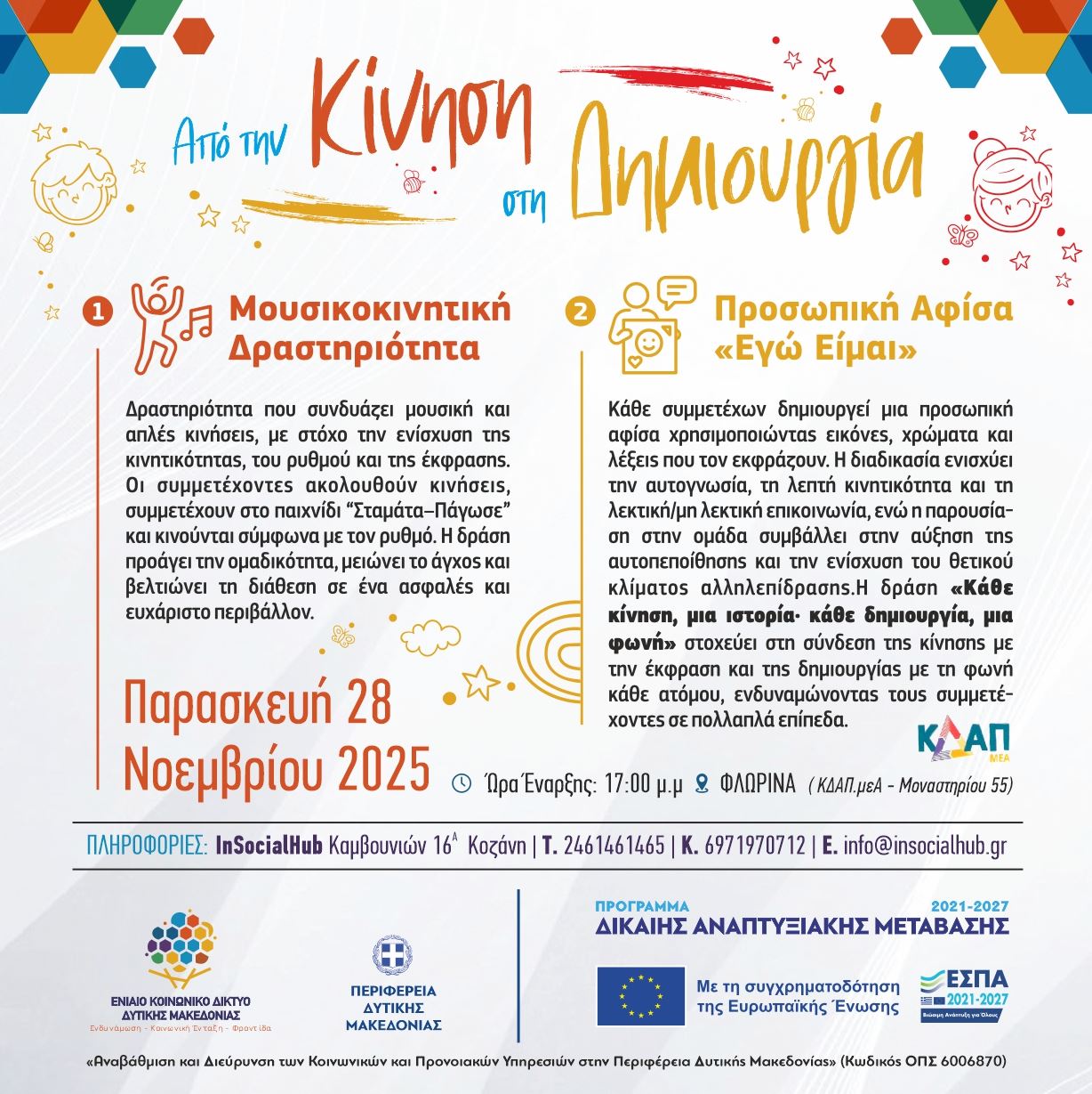 Το Κέντρο Δημιουργικής Απασχόλησης Παιδιών με Αναπηρία (ΚΔΑΠ ΜΕΑ) διοργανώνει την εκδήλωση «Από την Κίνηση στη Δημιουργία», την Παρασκευή 28 Νοεμβρίου 2025 και ώρα 17:00 μ.μ., στον χώρο του ΚΔΑΠ.μεΑ (Μοναστηρίου 55).