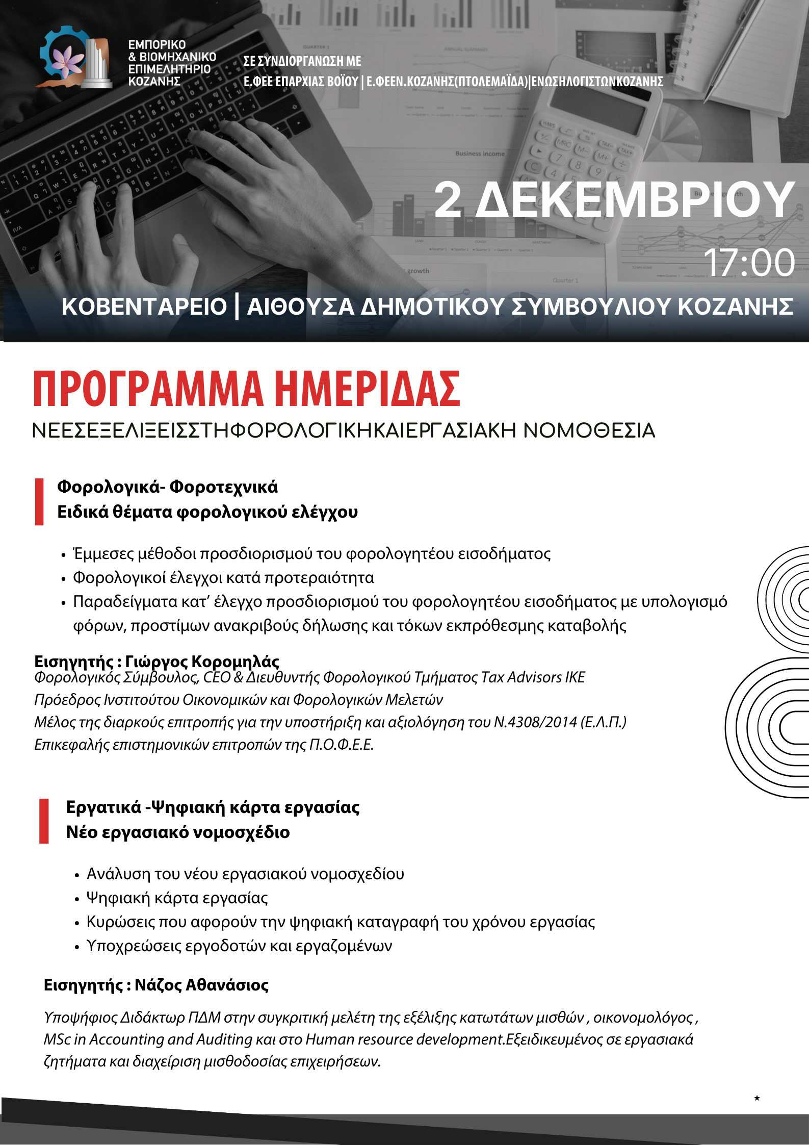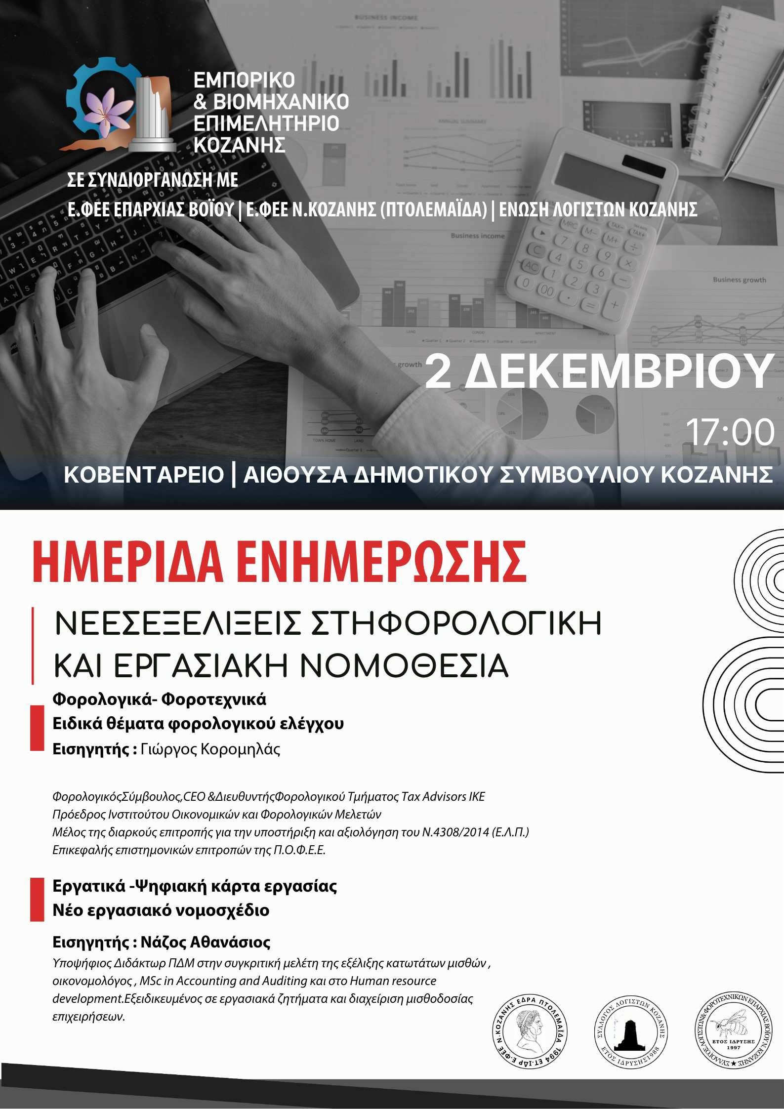 Το Επιμελητήριο Κοζάνης, σε συνδιοργάνωση με την Ε.Φ.Ε.Ε. Επαρχίας Βοΐου, την Ε.Φ.Ε.Ε. Ν. Κοζάνης (Πτολεμαΐδα) και την Ένωση Λογιστών Κοζάνης, διοργανώνει ενημερωτική ημερίδα με θέμα: «Νέες Εξελίξεις στη Φορολογική και Εργασιακή Νομοθεσία» την Τρίτη 2 Δεκεμβρίου, ώρα 17:00 , στην αίθουσα συνεδριάσεων Διοικητικού Συμβουλίου Κοζάνης στο Κοβεντάρειο (Χ. ΜΟΥΚΑ 7, ΚΟΖΑΝΗ).