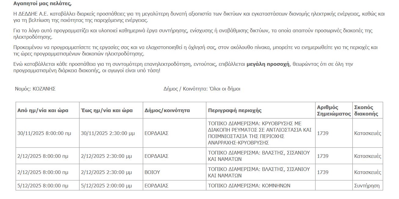 Εορδαία: Διακοπές ρεύματος το επόμενο διάστημα