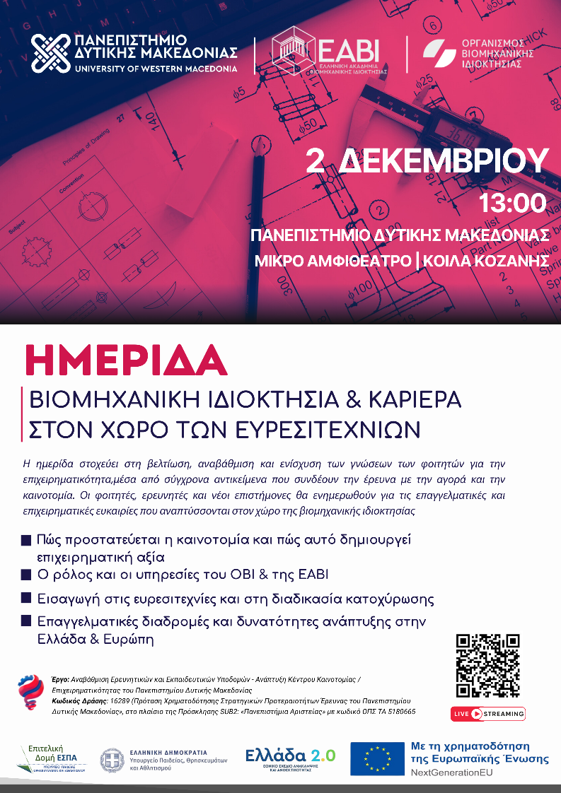 «Βιομηχανική Ιδιοκτησία & Καριέρα στον Χώρο των Ευρεσιτεχνιών», σε συνεργασία με τον Οργανισμό Βιομηχανικής Ιδιοκτησίας (ΟΒΙ) και την Ελληνική Ακαδημία Βιομηχανικής Ιδιοκτησίας (ΕΑΒΙ).