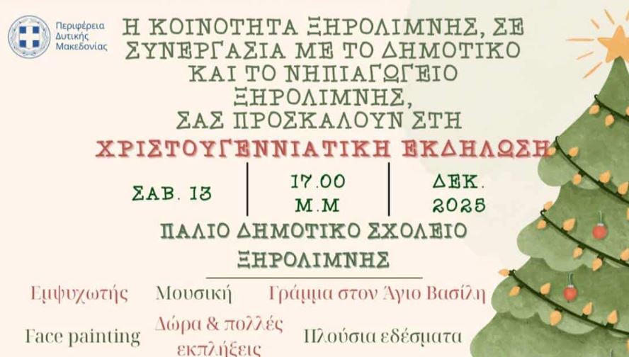 Η Κοινότητα Ξηρολίμνης, σε συνεργασία με το Δημοτικό Σχολείο και το Νηπιαγωγείο Ξηρολίμνης, σας προσκαλούν σε μια ξεχωριστή Χριστουγεννιάτικη Εκδήλωση γεμάτη χαμόγελα, μουσική και γιορτινή διάθεση!