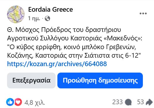 Η χθεσινή ανάρτηση του kozan.gr, στη σελίδα μας στο facebook Eordaia Greece (δείτε εδώ), με την αναγγελία από τον Θωμά Μόσχου, Προέδρου του δραστήριου Αγροτικού Συλλόγου Καστοριάς «Μακεδνός», για το κοινό μπλόκο Γρεβενών–Κοζάνης–Καστοριάς στη Σιάτιστα στις 6/12, προκάλεσε πλήθος θετικών σχολίων. Σ’ ένα 24ωρο η δημοσίευση άγγιξε τις 5.000 θετικές αντιδράσεις, ενώ εκατοντάδες πολίτες –αγρότες και μη– έσπευσαν να εκφράσουν τη στήριξή τους. Τα σχόλια που ακολουθούν είναι ενδεικτικά της δυναμικής του: