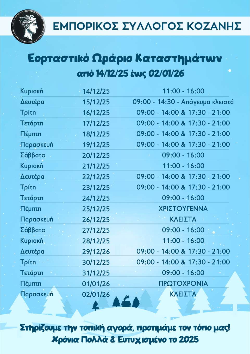 Ο Εμπορικός Σύλλογος Κοζάνης ανακοινώνει το εορταστικό Ωράριο των καταστημάτων για τις ημέρες των Χριστουγέννων και της Πρωτοχρονιάς. Ευχόμαστε καλά και χαρούμενα Χριστούγεννα σε όλο τον κόσμο και καλές δουλειές σε όλους τους συναδέλφους !