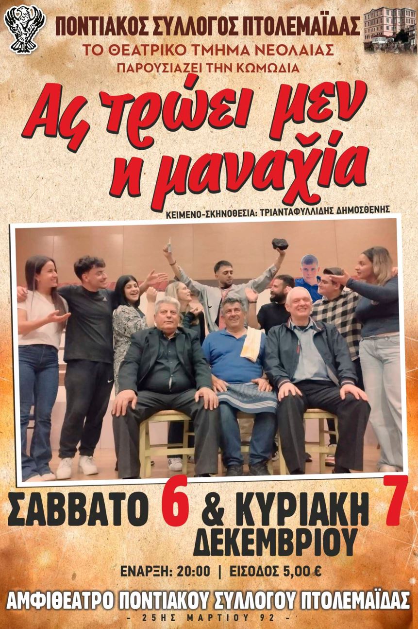 Μετά από την επιτυχημένη παρουσίαση της θεατρικής παράστασης ”Ας Τρώει Μεν η Μανασία” σε σκηνοθεσία Δημοσθένη Τριανταφυλλίδη, του Θεατρικού Τμήματος Νεολαίας του Συλλόγου και την αποδοχή που είχε από το θεατρόφιλο κοινό της πόλης μας, σας προσκαλούμε το Σάββατο 6 και την Κυριακή 7 Δεκεμβρίου 2025 και ώρα 20:00 στο Αμφιθέατρο του συλλόγου, να απολαύσετε τα παιδιά μας για δύο μοναδικές παραστάσεις.