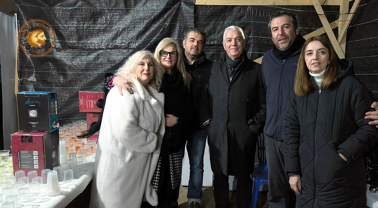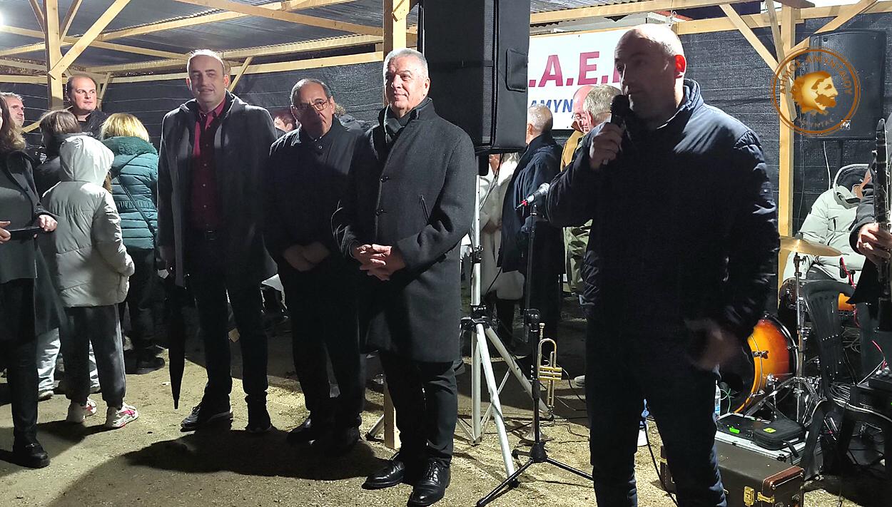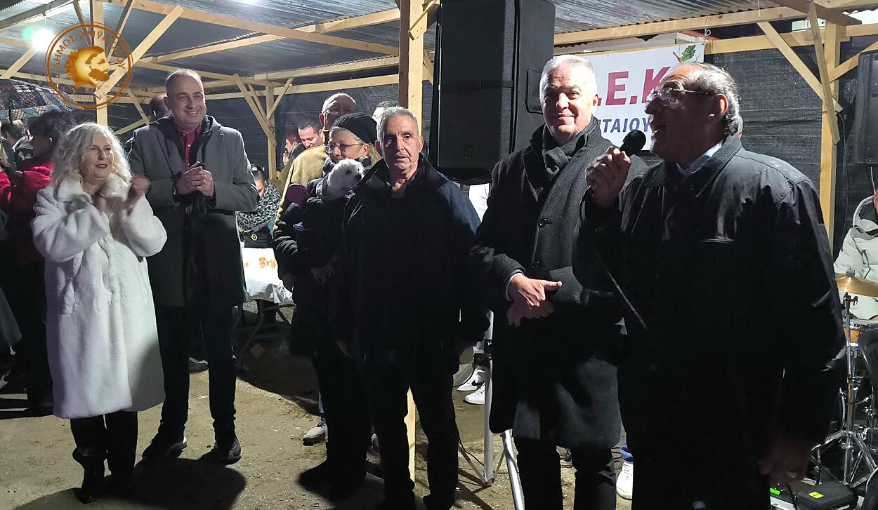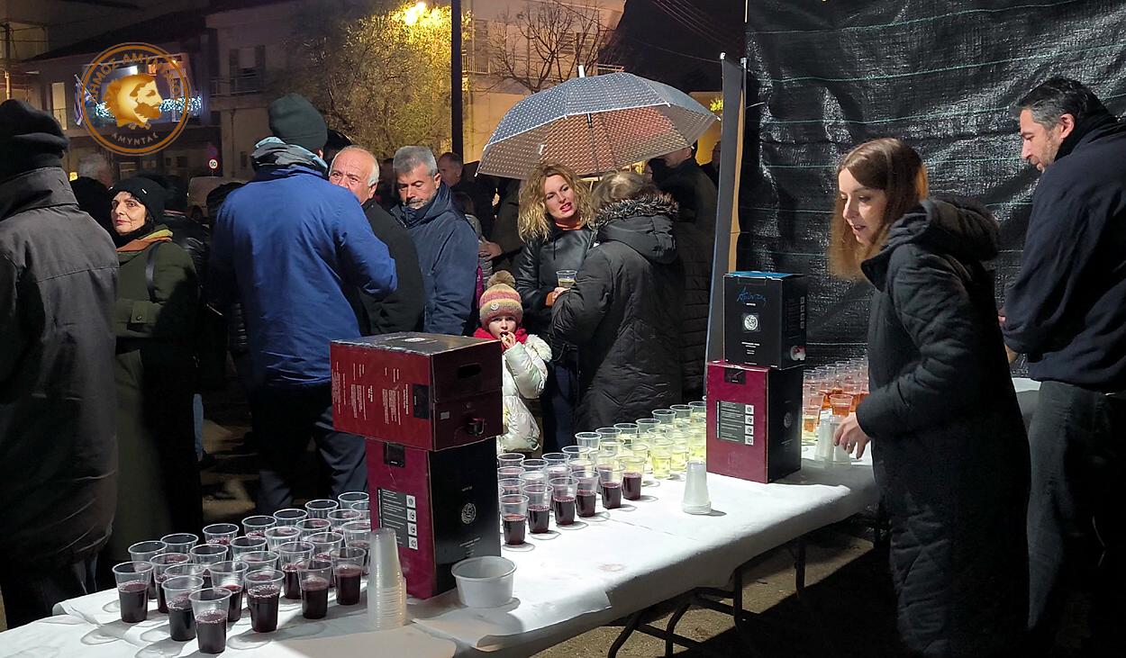 Οι παρευρισκόμενοι απόλαυσαν άφθονο τοπικό κρασί, ζεστή φασολάδα, λουκουμάδες και παραδοσιακά εδέσματα που προσφέρθηκαν δωρεάν, δημιουργώντας μια ατμόσφαιρα φιλοξενίας και γιορτής. Η βραδιά ζωντάνεψε ακόμη περισσότερο με τους ήχους των χάλκινων πνευστών, που ώθησαν μικρούς και μεγάλους να χορέψουν και να γλεντήσουν με την ψυχή τους.