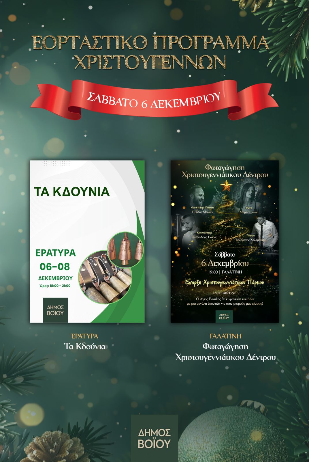 Αναλυτικά το πρόγραμμα των εκδηλώσεων του Δήμου Βοΐου είναι αναρτημένο στη σελίδα https://voio.gr/deltio-typou-i-mageia-ton-eortastikon-ekdiloseon-sto-voio-eortastiko-programma-christougennon/