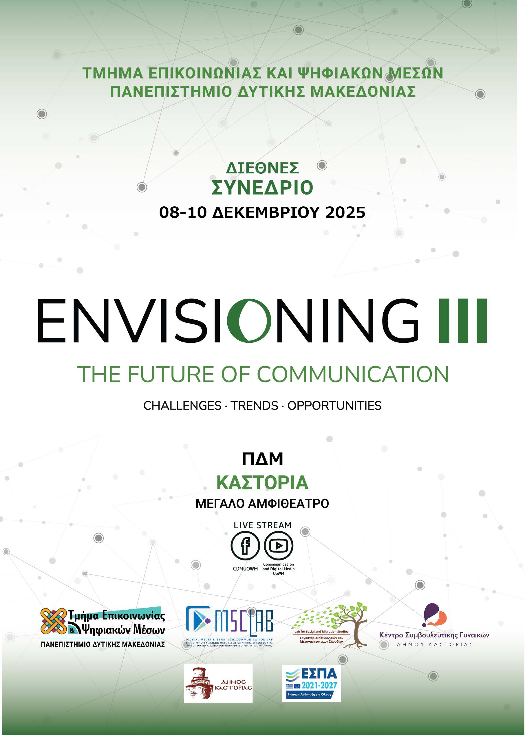 - Διεθνές Συνέδριο, 8–10 Δεκεμβρίου 2025. Το Τμήμα Επικοινωνίας και Ψηφιακών Μέσων, το Εργαστήριο Κοινωνικών και Μεταναστευτικών Σπουδών και το Εργαστήριο Ψηφιακών Μέσων και Στρατηγικής Επικοινωνίας του Πανεπιστημίου Δυτικής Μακεδονίας διοργανώνουν Επιστημονικό Συνέδριο, με θέμα: “Envisioning the Future of Communication III: Challenges · Trends · Opportunities”. Το Κέντρο Συμβουλευτικής Γυναικών του Δήμου Καστοριάς συνδιοργανώνει με το ΠΔΜ την πρώτη ημέρα του συνεδρίου 8/12/2025, με θεματικό άξονα: «Φύλο και ΜΜΕ».