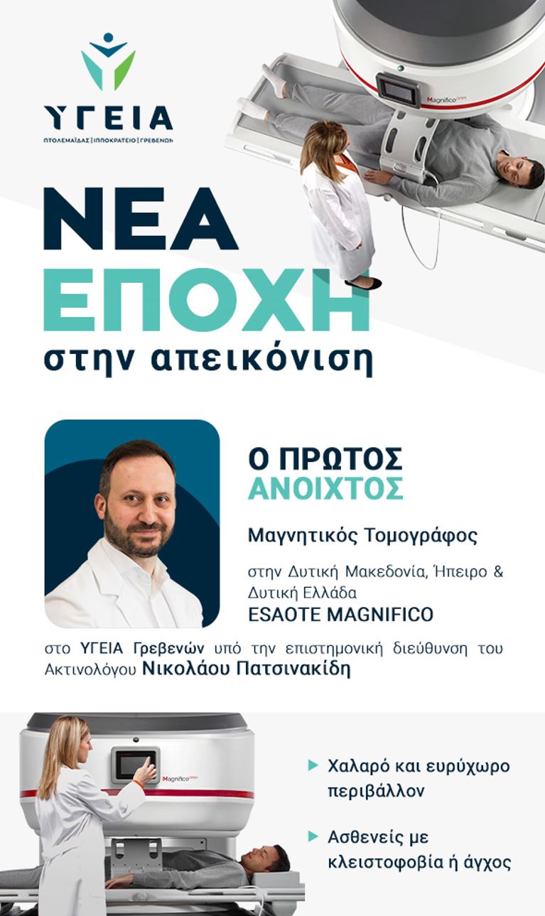 Ο Όμιλος ΥΓΕΙΑ Πτολεμαΐδας ανακοινώνει με υπερηφάνεια την εγκατάσταση του 1ου σύγχρονου ανοιχτού Μαγνητικού Τομογράφου ESAOTE MAGNIFICO στη Δυτική Μακεδονία, Ήπειρο και Δυτική Ελλάδα.