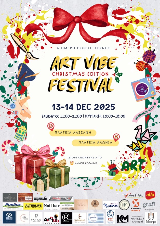 Το Φεστιβάλ Τέχνης «Art Vibe» του Δήμου Κοζάνης, μετά την επιτυχία που σημείωσε φέτος το Καλοκαίρι, επιστρέφει με Χριστουγεννιάτικη διάθεση αυτή τη φορά για να σας ταξιδέψει σε όμορφες εορταστικές δημιουργίες, που θα σας συναρπάσουν!