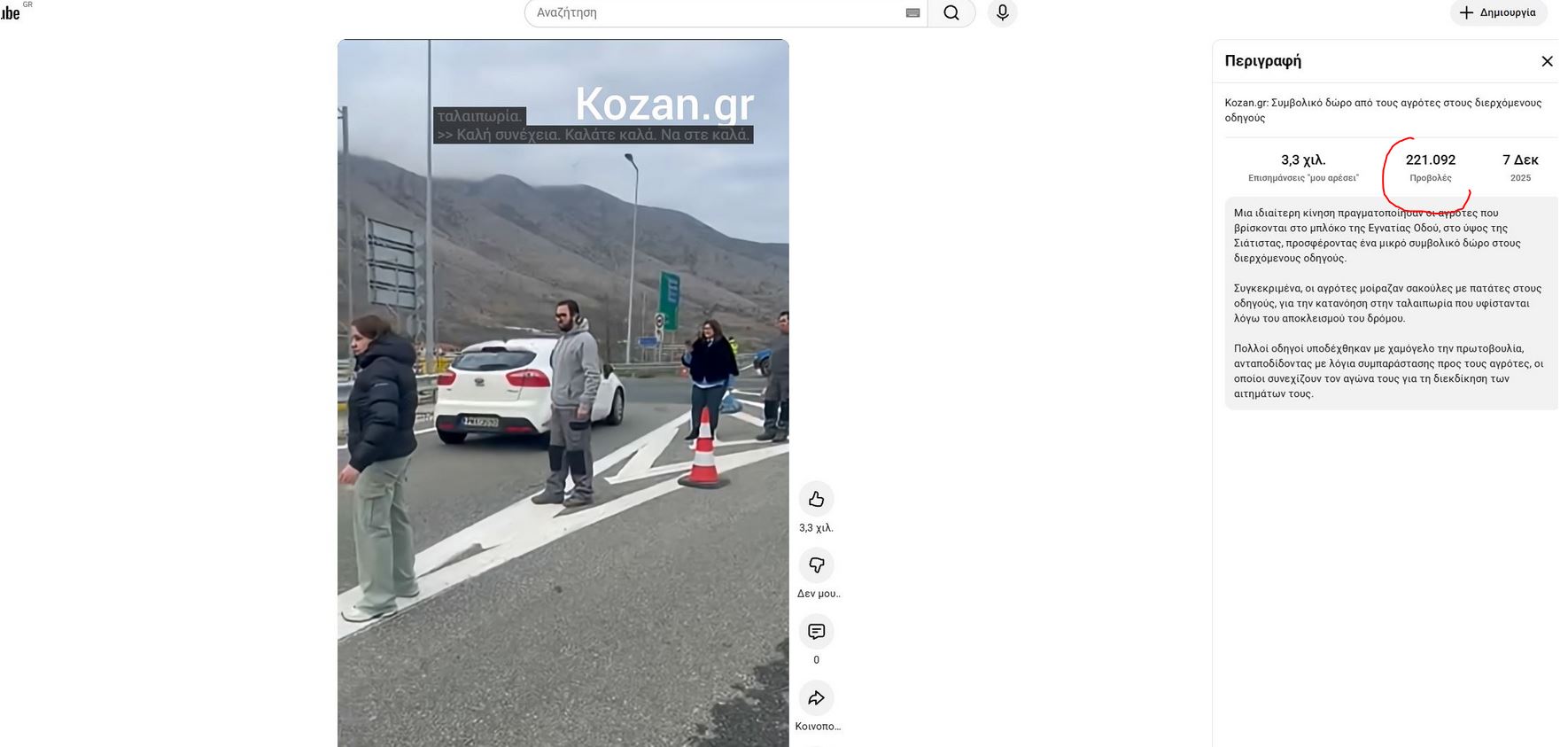 Το βίντεο του kozan.gr με το συμβολικό δώρο των αγροτών του μπλόκου των αγροτών στην Σιάτιστα στους διερχόμενους οδηγούς ξεπέρασε τις 221.000 προβολές στο YouTube και τις 260.000 στο Tik Tok, μέσα σε λιγότερο από 48 ώρες, με ό,τι αυτό συνεπάγεται για την απήχηση που είχε και στις δύο συγκεκριμένες διαδικτυακές πλατφόρμες. Το συγκεκριμένο βίντεο μπήκε σε χιλιάδες timelines, ταξίδεψε σε κάθε γωνιά της χώρας κι έβγαλε προς τα έξω το συμβολικό μήνυμα των αγροτών με τρόπο άμεσο κι ανθρώπινο.