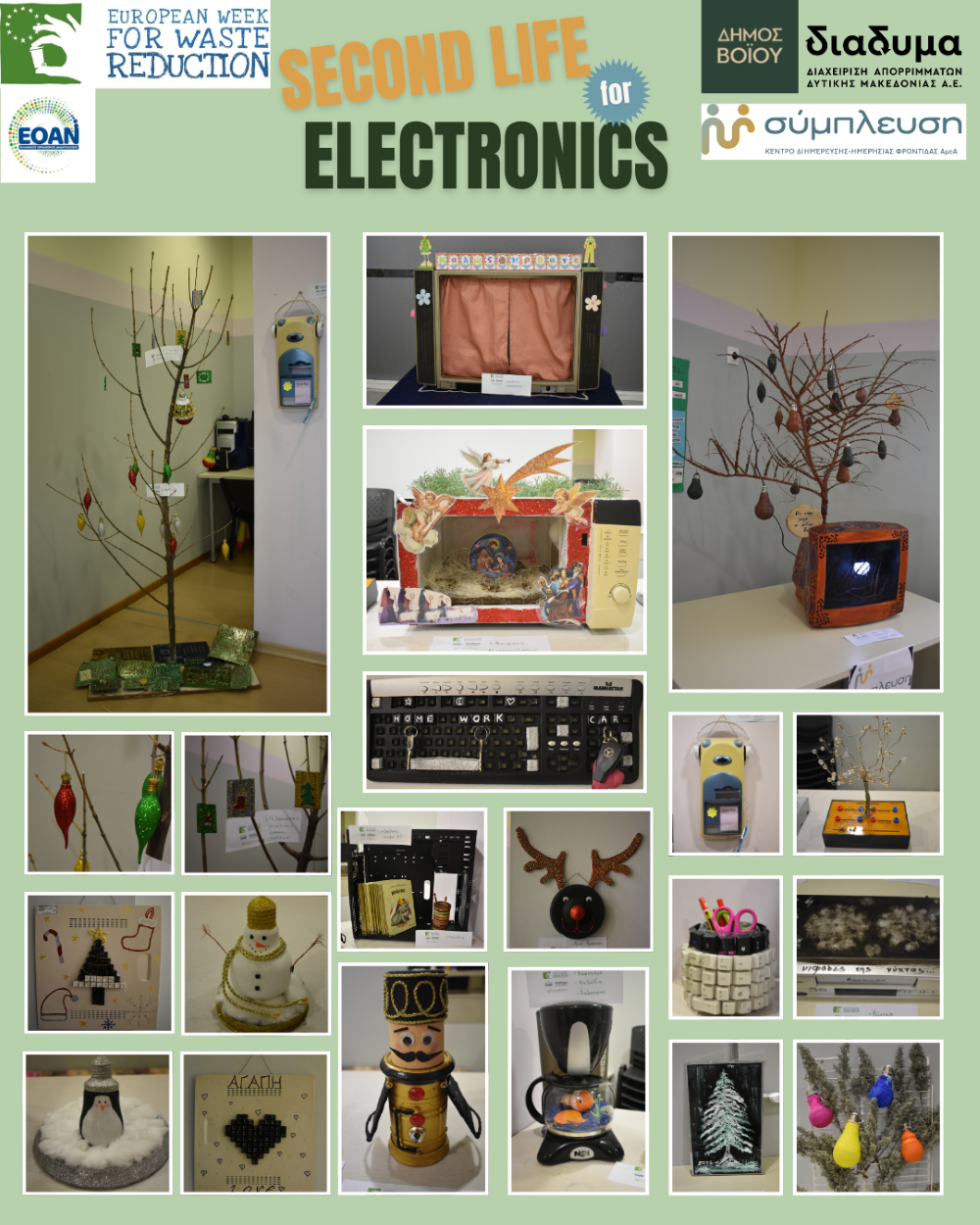 Στους χώρους της δομής ΚΔΑΠ ΑμεΑ «Σύμπλευση» στη Νεάπολη, σε συνεργασία με τον Δήμο Βοΐου και τα ΚΔΗΦ ΑμεΑ «Σύμπλευση» της Κοζάνης και των Γρεβενών, παρουσιάστηκε έκθεση δημιουργιών των ωφελούμενων, κατασκευασμένων από παλιές ηλεκτρικές και ηλεκτρονικές συσκευές και λαμπτήρες, αναδεικνύοντας τη δύναμη της φαντασίας και της επαναχρησιμοποίησης. Παράλληλα, οι πολίτες που παρευρέθηκαν συμμετείχαν ενεργά φέρνοντας για ανακύκλωση χαλασμένες ηλεκτρικές συσκευές και λαμπτήρες.