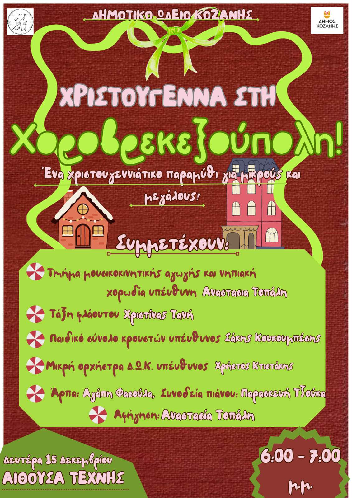 Το Δημοτικό Ωδείο Κοζάνης προσκαλεί τους μικρούς και μεγάλους φίλους του στην χριστουγεννιάτικη εκδήλωση με τίτλο «Χριστούγεννα στη Χοροβρεκεξούπολη», που θα πραγματοποιηθεί τη Δευτέρα 15 Δεκεμβρίου, στις 6:00 μ.μ., στην Αίθουσα Τέχνης.