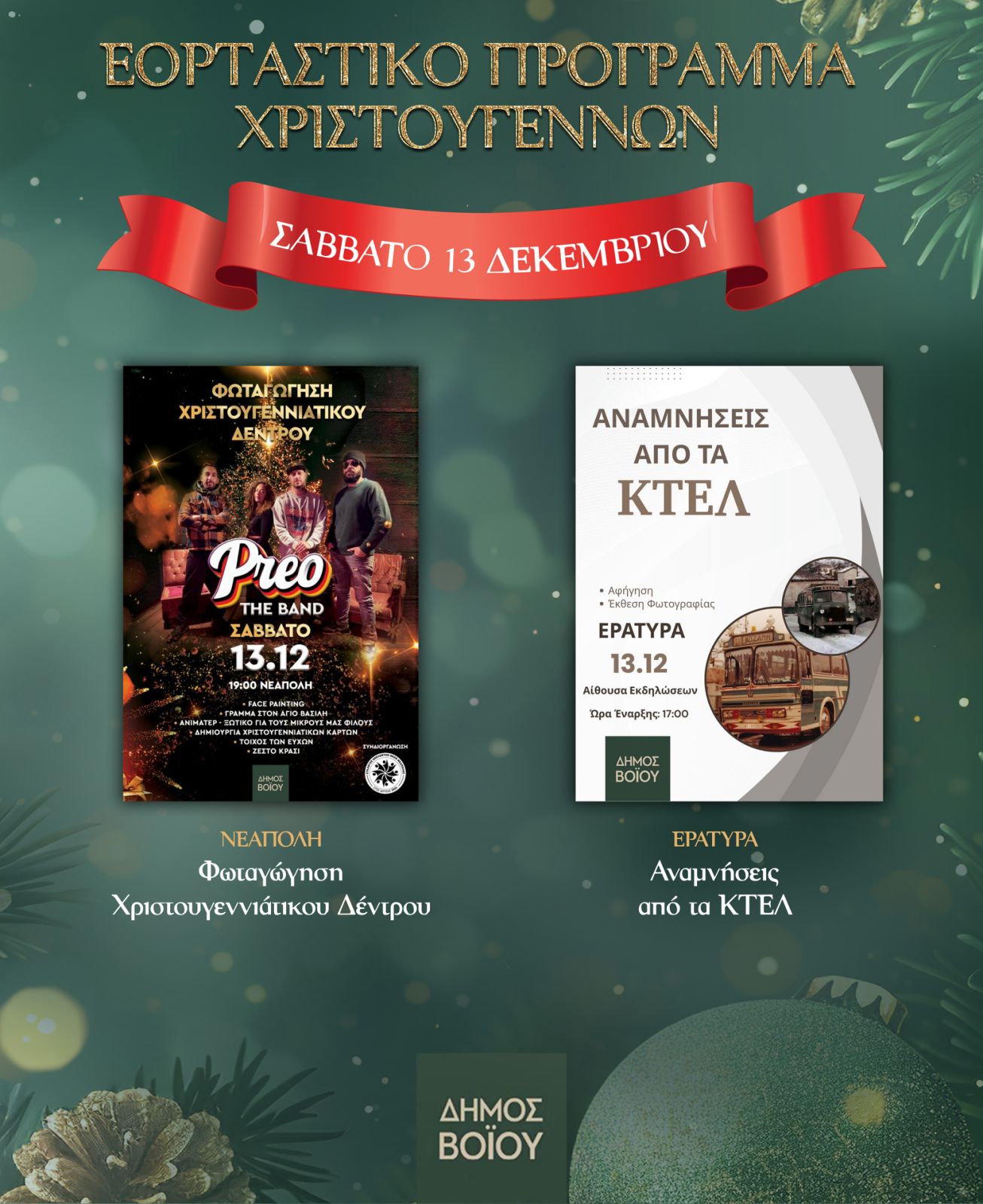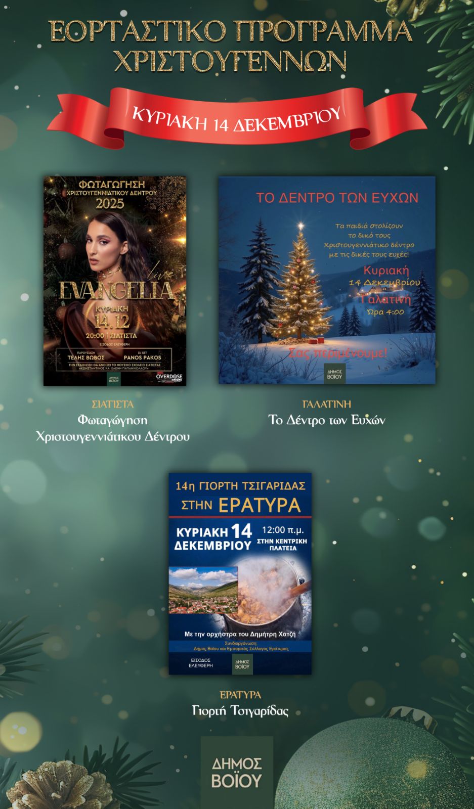 Πλούσιο είναι το εορταστικό πρόγραμμα του Δήμου Βοΐου και αυτό το τριήμερο (12-14 Δεκεμβρίου), το οποίο περιλαμβάνει φωταγωγήσεις Χριστουγεννιάτικων Δέντρων, πληθώρα άλλων εκδηλώσεων, καθώς και την μεγάλη συναυλία της Ευαγγελίας που θα πραγματοποιηθεί στην Σιάτιστα την Κυριακή 14 Δεκεμβρίου.