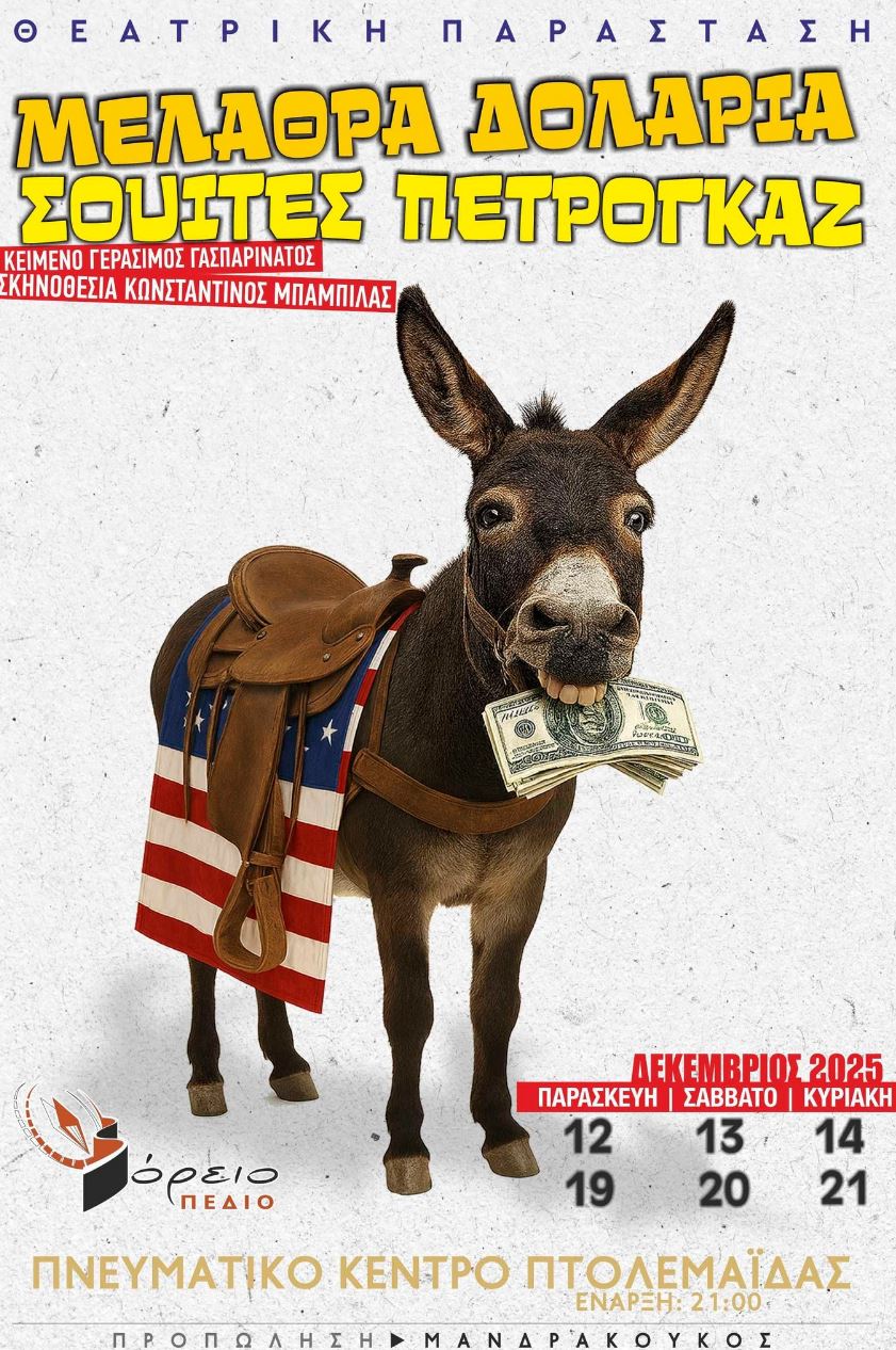 Η νέα θεατρική παραγωγή «Μελάθρα Δολάρια Σουίτες Πετρογκάζ» μας μεταφέρει στον κάμπο της Θεσσαλίας, σε μια εποχή όπου η μετεμφυλιακή Ελλάδα προσπαθεί να αναπτυχθεί και να ενταχθεί στη ζωή της κάθε ξενόφερτη καινοτομία. Η πλατεία του χωριού γίνεται το σκηνικό όπου η απλή ζωή των κατοίκων αναστατώνεται από μια απρόσμενη επιστροφή, πυροδοτώντας μια σειρά από κωμικοτραγικές καταστάσεις.