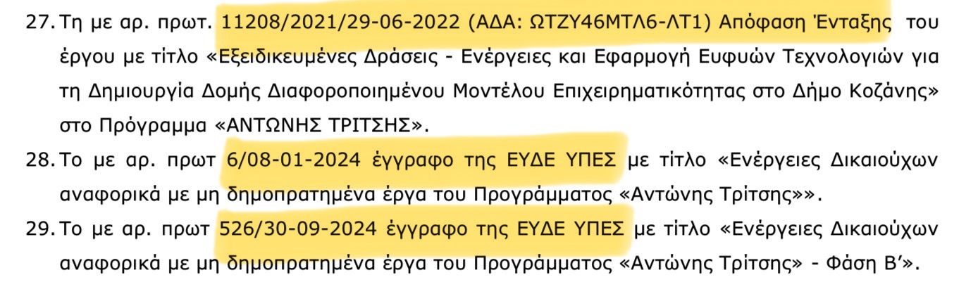 Το έργο με τίτλο «Εξειδικευμένες Δράσεις – Ενέργειες και Εφαρμογή Ευφυών Τεχνολογιών για τη Δημιουργία Δομής Διαφοροποιημένου Μοντέλου Επιχειρηματικότητας στο Δήμο Κοζάνης», προϋπολογισμού 1,4 εκατομμύρια ευρώ περίπου, εντάχθηκε στο πρόγραμμα στις 29-6-2022 και όπως προκύπτει από τη Απόφαση απένταξης παρά τις προειδοποιήσεις της ΕΥΔΕ του ΥΠΕΣ στις 8-1-2024 και στις 30-9-2024 ο Δήμος Κοζάνης, προφανώς, δεν ανταποκρίθηκε με συνέπεια ο ΥΠΕΣ να προχωρήσει στη απένταξης του.