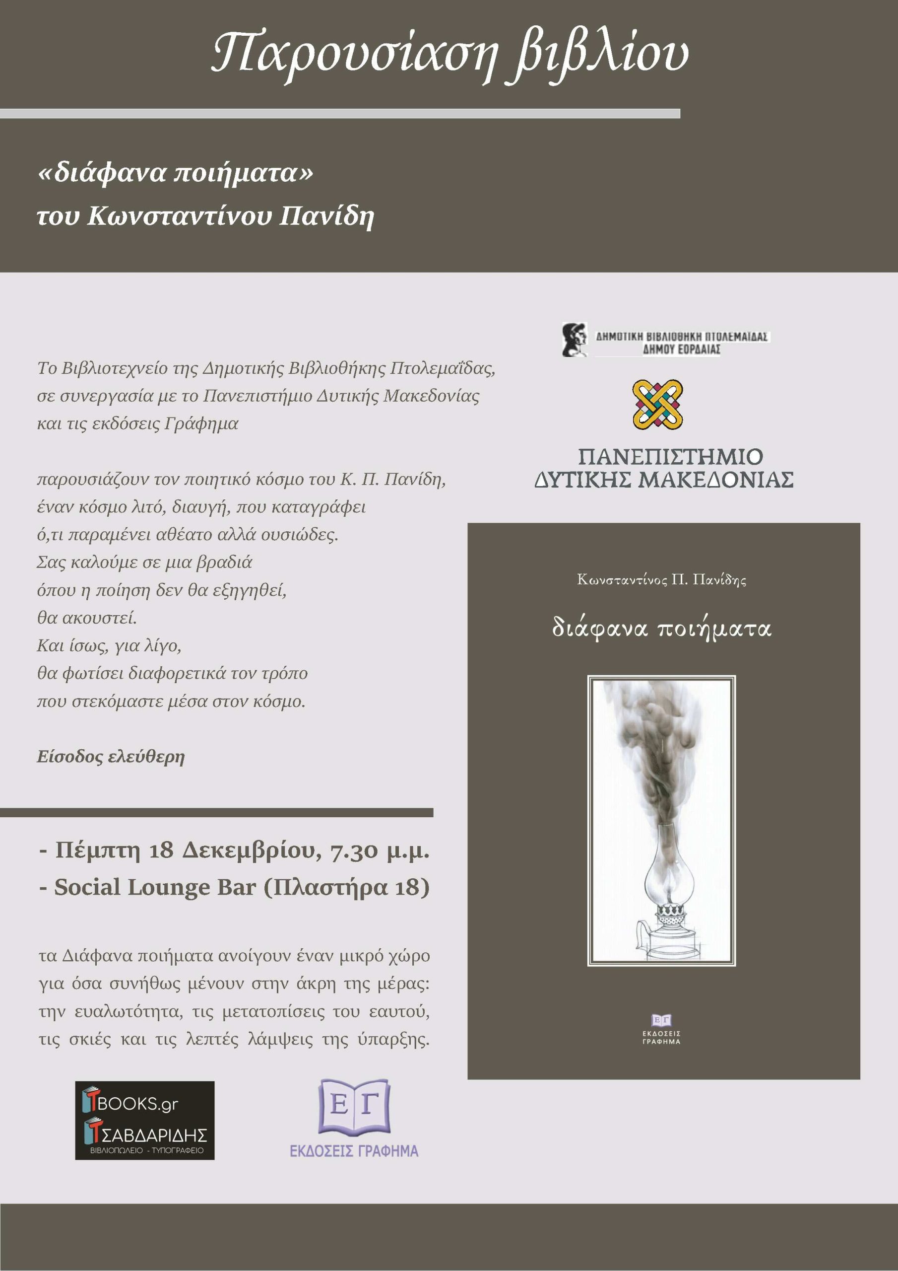 Το Βιβλιοτεχνείο της Δημοτικής Βιβλιοθήκης Πτολεμαΐδας, σε συνεργασία με το Πανεπιστήμιο Δυτικής Μακεδονίας, τις εκδόσεις Γράφημα και το βιβλιοπωλείο Τσαβδαρίδη παρουσιάζει τον ποιητικό κόσμο του Κωνσταντίνου Π. Πανίδη, έναν κόσμο λιτό, διαυγή, που καταγράφει ό,τι παραμένει αθέατο αλλά ουσιώδες.