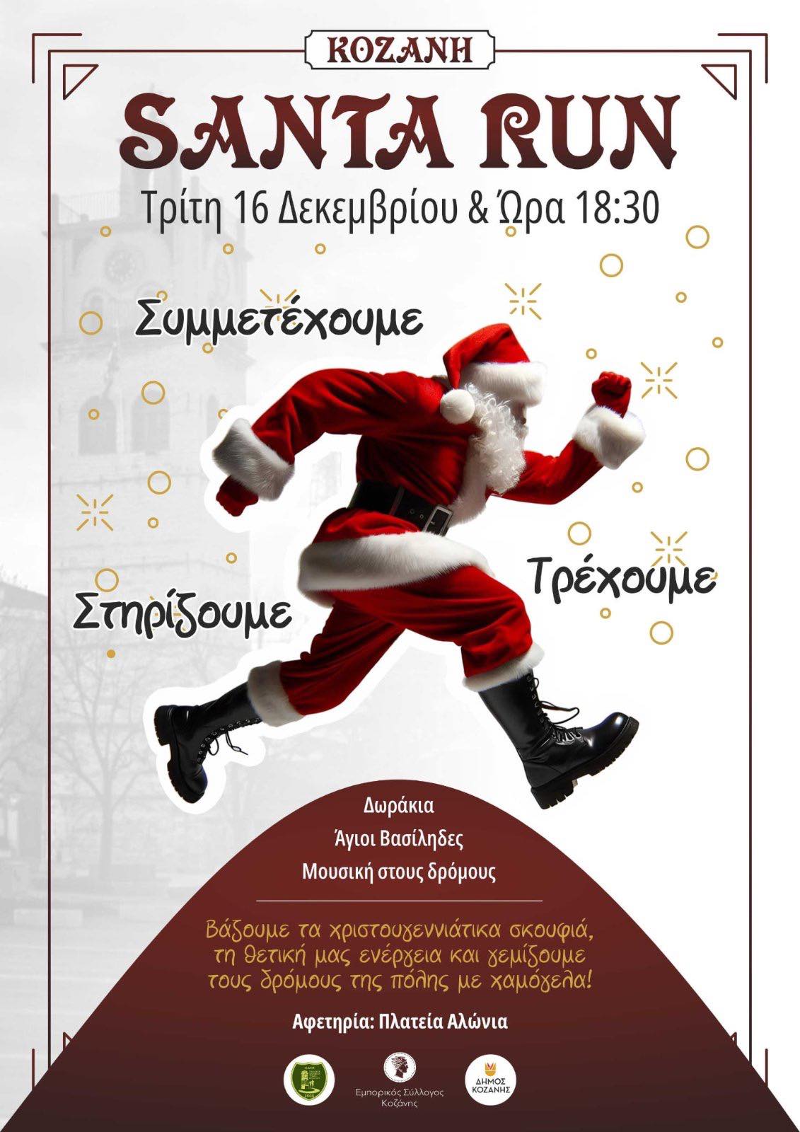 Ο Σύλλογος μας συνδιοργανώνει με το Δήμο Κοζάνης και τον Εμπορικό Σύλλογο Κοζάνης συμβολικό, μη αγωνιστικό αγώνα δρόμου Santa Run με φιλανθρωπικό χαρακτήρα. Είναι ένας αγώνας ανθρωπιάς, αλληλεγγύης και προσφοράς με στόχο να συγκεντρωθούν τρόφιμα για τους συμπολίτες μας που έχουν ανάγκη . Η εκκίνηση θα δοθεί από την πλατεία Αλώνια την Τριρη 16.12.2025 στις 18:30 θα διασχίσει τις οδούς Μακεδονομάχων, Μ Αλεξάνδρου και Τσιμηνακη και από την πλατεία Λασσανη θα καταλήξει στην οδό Βενιζέλου , όπου ο Εμπορικός Σύλλογος Κοζάνης έχει ετοιμάσει πάρτι με dj και πολλές εκπλήξεις. Κατά την εκκίνηση θα διατεθούν στους συμμετέχοντες κόκκινοι σκούφοι, προσφορά του Εμπορικού Συλλόγου . Καλούμε όλα τα μέλη μας, με τις οικογένειες τους να συμμετάσχουν σε αυτόν τον αγώνα αλληλεγγύης και προσφοράς και να χαρούν τη χριστουγεννιάτικα στολισμένη πόλη.