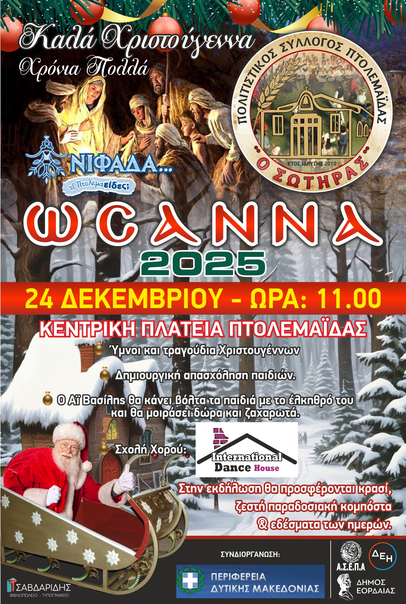“ΩΣΑΝΝΑ 2025” στην κεντρική πλατεία Πτολεμαΐδας με ύμνους και τραγούδια Χριστουγέννων στις 24 Δεκεμβρίου και ώρα 11 π.μ. από τον Πολιτιστικό Σύλλογο Πτολεμαΐδας “Ο ΣΩΤΗΡΑΣ”.
