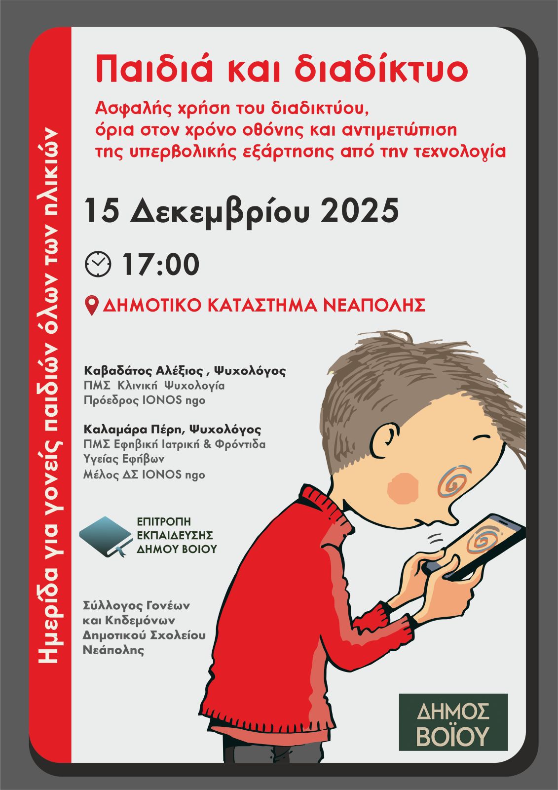 Ημερίδα με θέμα «Παιδιά και Διαδίκτυο: Ασφαλής χρήση του διαδικτύου, όρια στον χρόνο οθόνης και αντιμετώπιση της υπερβολικής εξάρτησης από την τεχνολογία» διοργανώνει ο Δήμος Βοΐου σε συνεργασία με τον Σύλλογο Γονέων και Κηδεμόνων του Δημοτικού Σχολείου Νεάπολης, τη Δευτέρα 15 Δεκεμβρίου, στις 17:00, στο Δημοτικό Κατάστημα Νεάπολης.