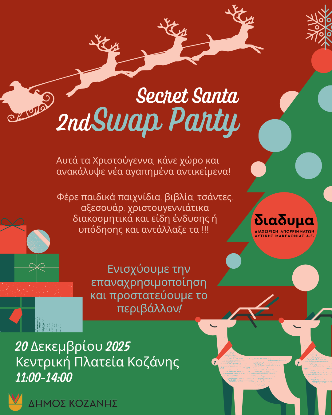 Η ΔΙΑΔΥΜΑ Α.Ε., στο πλαίσιο των χριστουγεννιάτικων εκδηλώσεων του Δήμου Κοζάνης, σας προσκαλεί, το Σάββατο, 20 Δεκεμβρίου 2025, στις 11:00-14:00, στην Κεντρική Πλατεία Κοζάνης, στο 2nd Secret Santa Swap Party, μια δράση αφιερωμένη στην επαναχρησιμοποίηση!