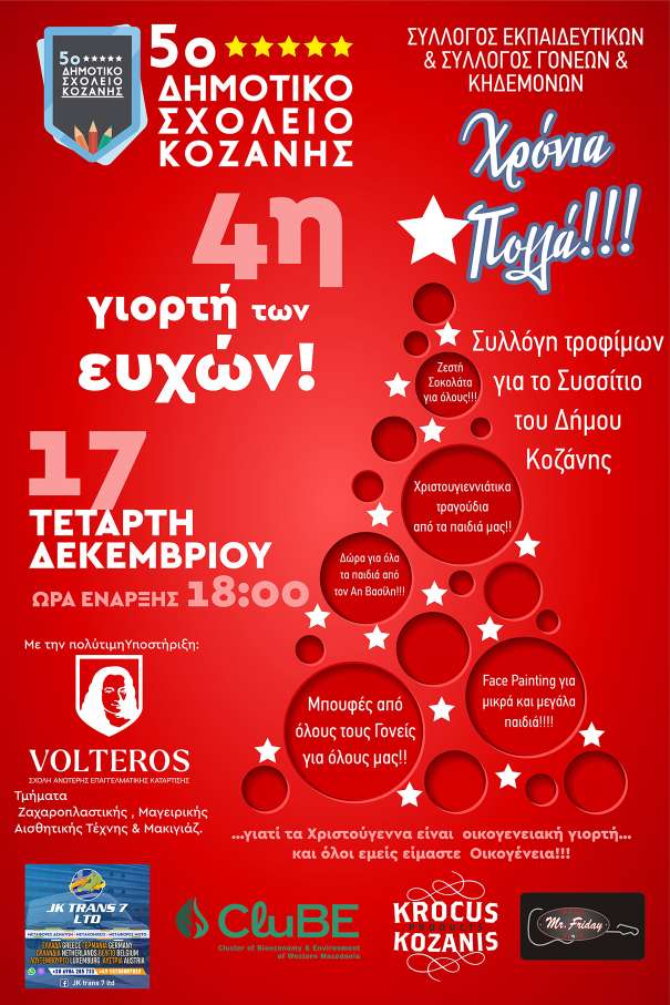 Tο 5ο Δημοτικό Σχολείο Κοζάνης ετοιμάζεται για τη 4η Γιορτή των Ευχών και σας καλεί όλους την Τετάρτη 17 Δεκεμβρίου, στις 18:00, για να μπούμε παρέα στο πνεύμα των Χριστουγέννων! Όπως κάθε χρόνο, έτσι και φέτος ο Σύλλογος Εκπαιδευτικών και ο Σύλλογος Γονέων & Κηδεμόνων ενώνουν τις δυνάμεις τους για μια ζεστή, χαρούμενη, οικογενειακή γιορτή – από αυτές που γεμίζουν το σχολείο με μυρωδιές, μουσικές και παιδικά γέλια. Τι έχουμε οργανώσει; Συλλογή τροφίμων για το Συσσίτιο του Δήμου Κοζάνης (για να βοηθήσουμε όσους μας χρειάζονται). Ζεστή σοκολάτα για όλους – γιατί Χριστούγεννα χωρίς σοκολάτα δεν γίνεται! Τα παιδιά του σχολείου θα μας πουν τα πιο γλυκά χριστουγεννιάτικα τραγούδια. Ο Άη Βασίλης θα μοιράσει δωράκια σε όλα τα παιδιά. Face painting για μικρούς και… λίγο μεγαλύτερους. Και φυσικά πλούσιος μπουφές, προσφορά των γονέων, για να μην φύγει κανείς νηστικός! Η γιορτή πραγματοποιείται με τη στήριξη της σχολής VOLTEROS, αλλά και επιχειρήσεων της πόλης που είναι δίπλα μας και φέτος. Ελάτε να ανταλλάξουμε ευχές, να διασκεδάσουμε και να θυμηθούμε όλοι ότι τα Χριστούγεννα είναι γιορτή αγάπης και… παρέας. Σας περιμένουμε! Χρόνια Πολλά!