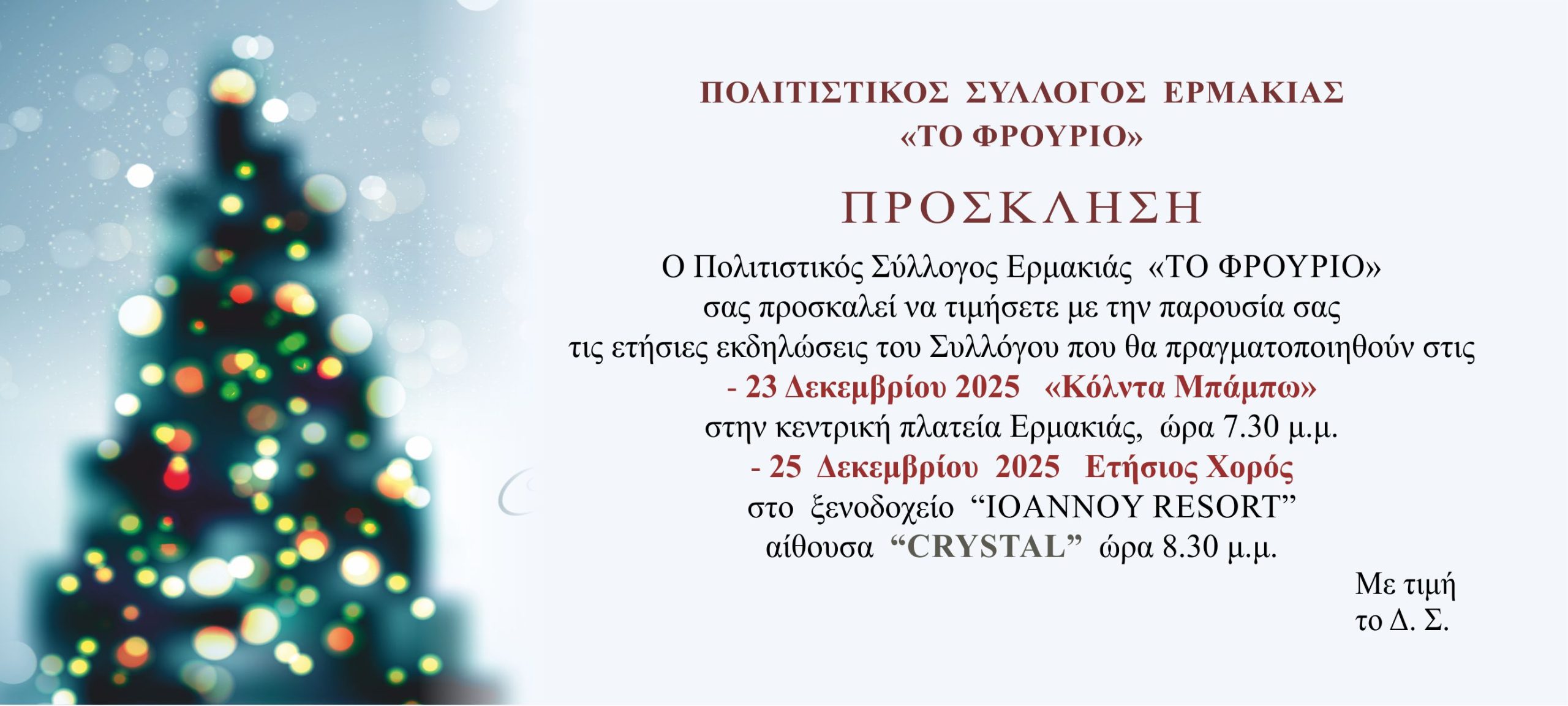 Ο Πολιτιστικός Σύλλογος Ερμακιάς “ΤΟ ΦΡΟΥΡΙΟ” με χαρά σας προσκαλεί στις Χριστουγεννιάτικες εκδηλώσεις του!