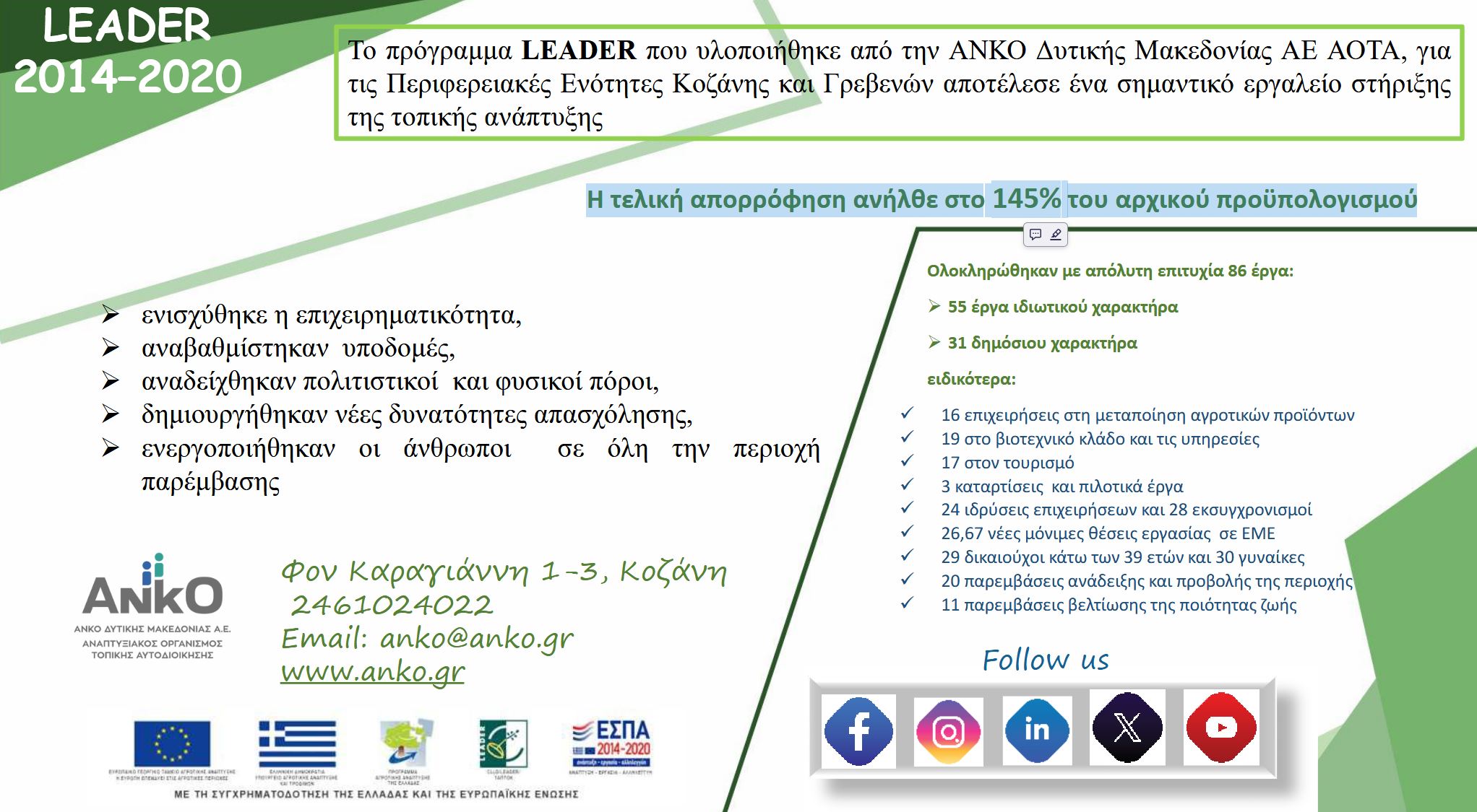 Το πρόγραμμα LEADER που υλοποιήθηκε από την ΑΝΚΟ Δυτικής Μακεδονίας ΑΕ ΑΟΤΑ, για τις Περιφερειακές Ενότητες Κοζάνης και Γρεβενών αποτέλεσε ένα σημαντικό εργαλείο στήριξης της τοπικής ανάπτυξης LEADER 2014–2020