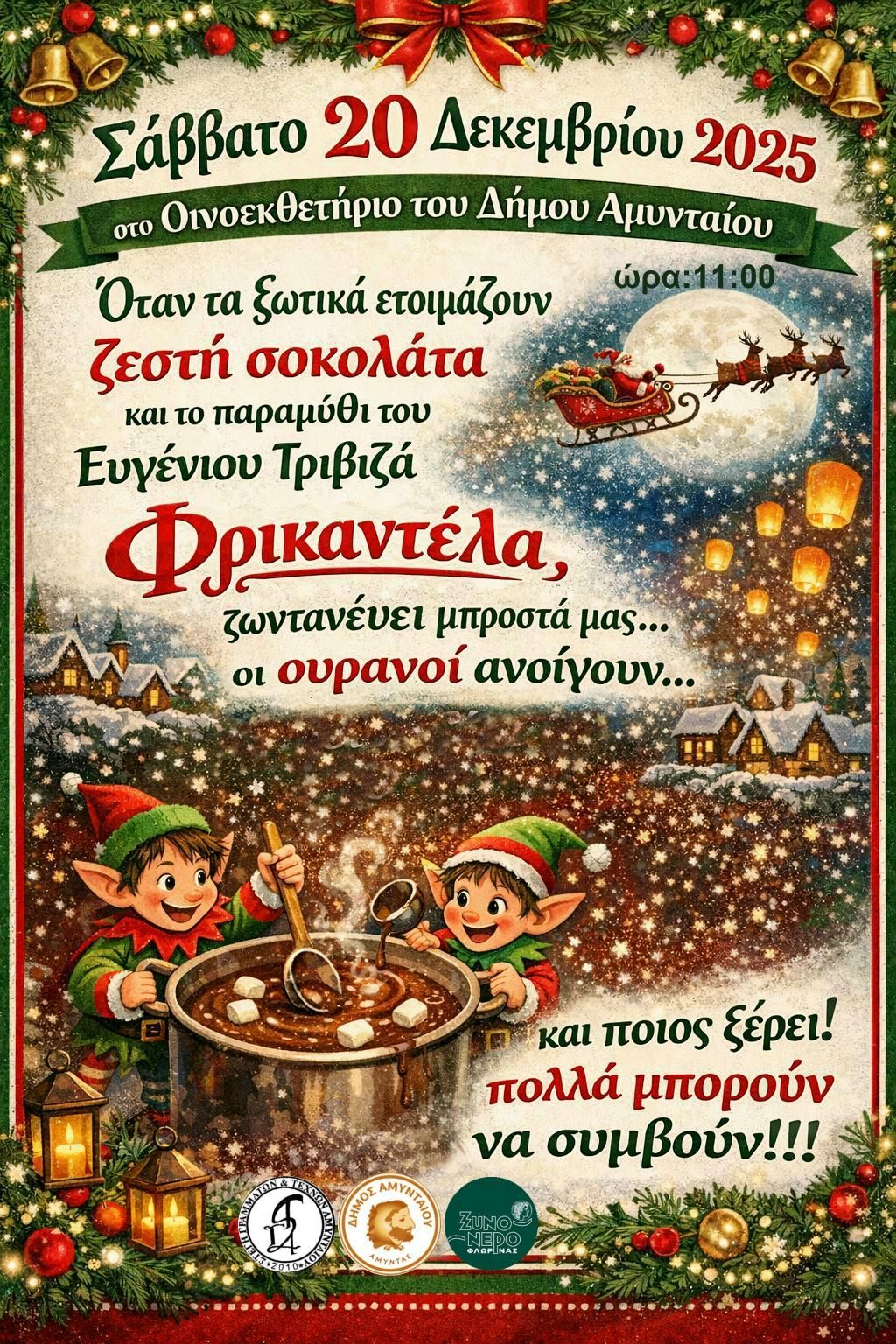 Το Σάββατο 20 Δεκεμβρίου 2025, στις 11:00 π.μ., το Οινοεκθετήριο του Δήμου Αμυνταίου μεταμορφώνεται σε έναν ζεστό, χριστουγεννιάτικο κόσμο φαντασίας και σας προσκαλεί σε μια ξεχωριστή εκδήλωση για μικρούς και μεγάλους.
