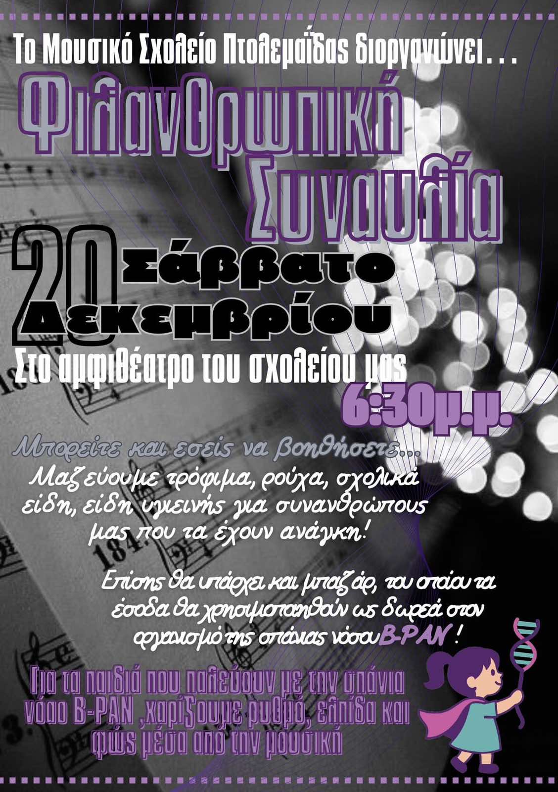 Το Μουσικό Σχολείο Πτολεμαΐδας διοργανώνει Φιλανθρωπική Συναυλία το Σάββατο 20 Δεκεμβρίου, στις 6:30 μ.μ., στο αμφιθέατρο του σχολείου. Μαθητές Γυμνασίου και Λυκείου ενώνουν τις δυνάμεις τους σε μια μουσική βραδιά προσφοράς και αλληλεγγύης. Κατά τη διάρκεια της εκδήλωσης θα συγκεντρωθούν τρόφιμα, ρούχα, σχολικά είδη και είδη υγιεινής για συνανθρώπους μας που έχουν ανάγκη, ενώ θα διεξαχθεί και μπαζάρ, τα έσοδα του οποίου θα προσφερθούν ως δωρεά στον οργανισμό της σπάνιας νόσου Β-ΡΑΝ. Ας στηρίξουμε με την παρουσία μας αυτή την πρωτοβουλία αγάπης και ανθρωπιάς!